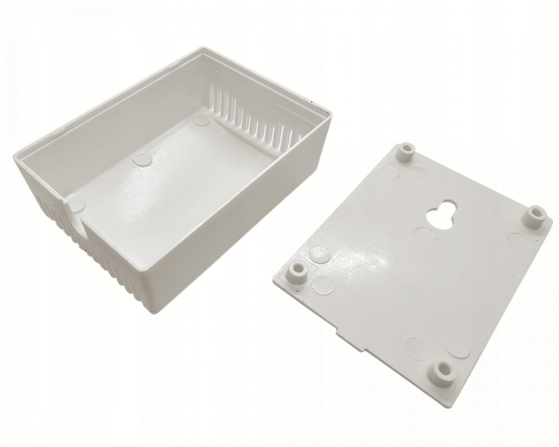 Корпус для датчиків температури та вологості захищає датчик від пошкоджень і водночас забезпечує достатній потік повітря, щоб вимірювання було якомога точним. Корпус складається за допомогою засувки, а також має отвір для підвішування.