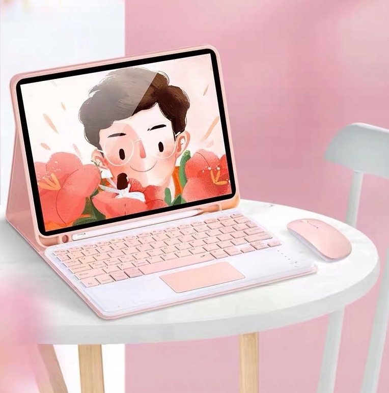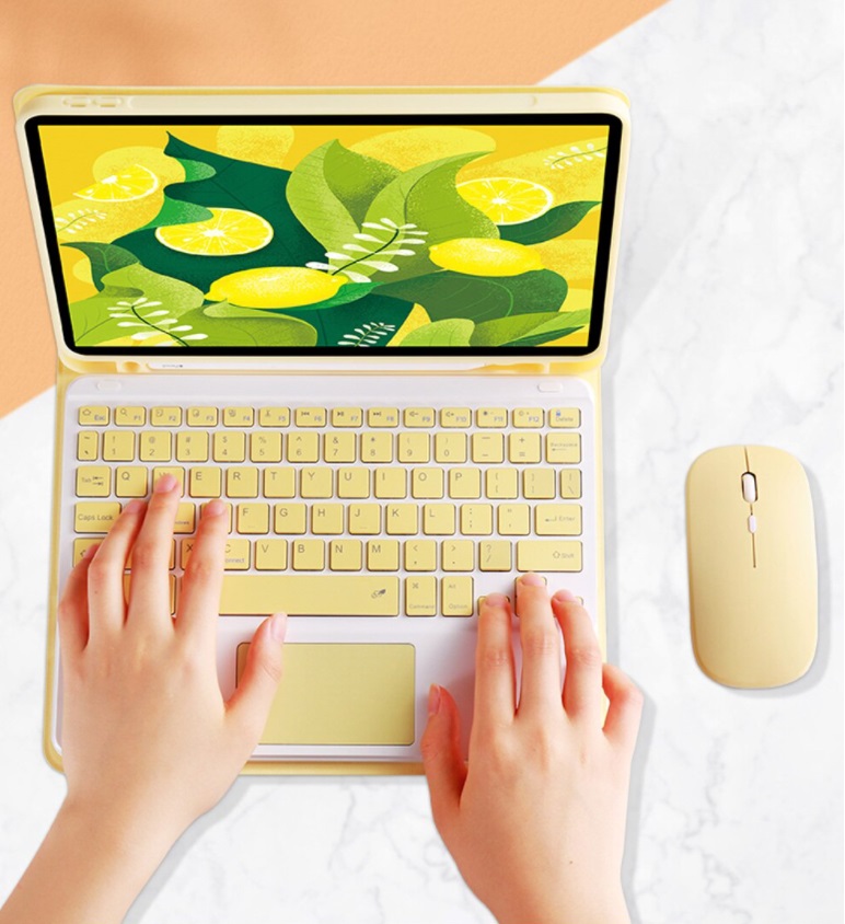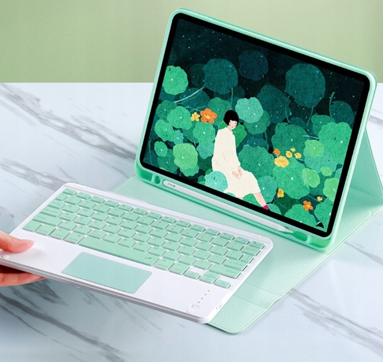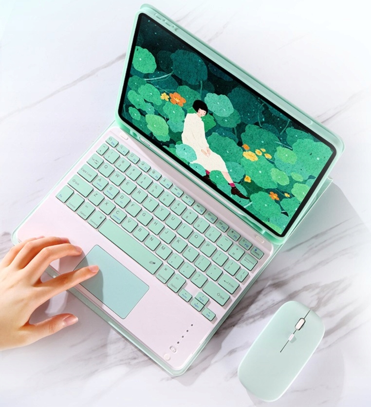Чохол виготовлений з дуже міцної екошкіри. Планшет і захист виглядають естетично завдяки мінімальній товщині корпусу. Наш планшет захищений на 100%. Вам не доведеться турбуватися про подряпини або механічні пошкодження. Крім того, усі прорізи та кнопки оголені. Bluetooth клавіатура дуже високої якості. Бездротове з'єднання миттєве. Клавіатура має вбудований тачпад. Мишка, що входить в комплект, підключається по бездротовій мережі через Bluetooth. Завдяки цим аксесуарам ви створите функціональний Macbook.