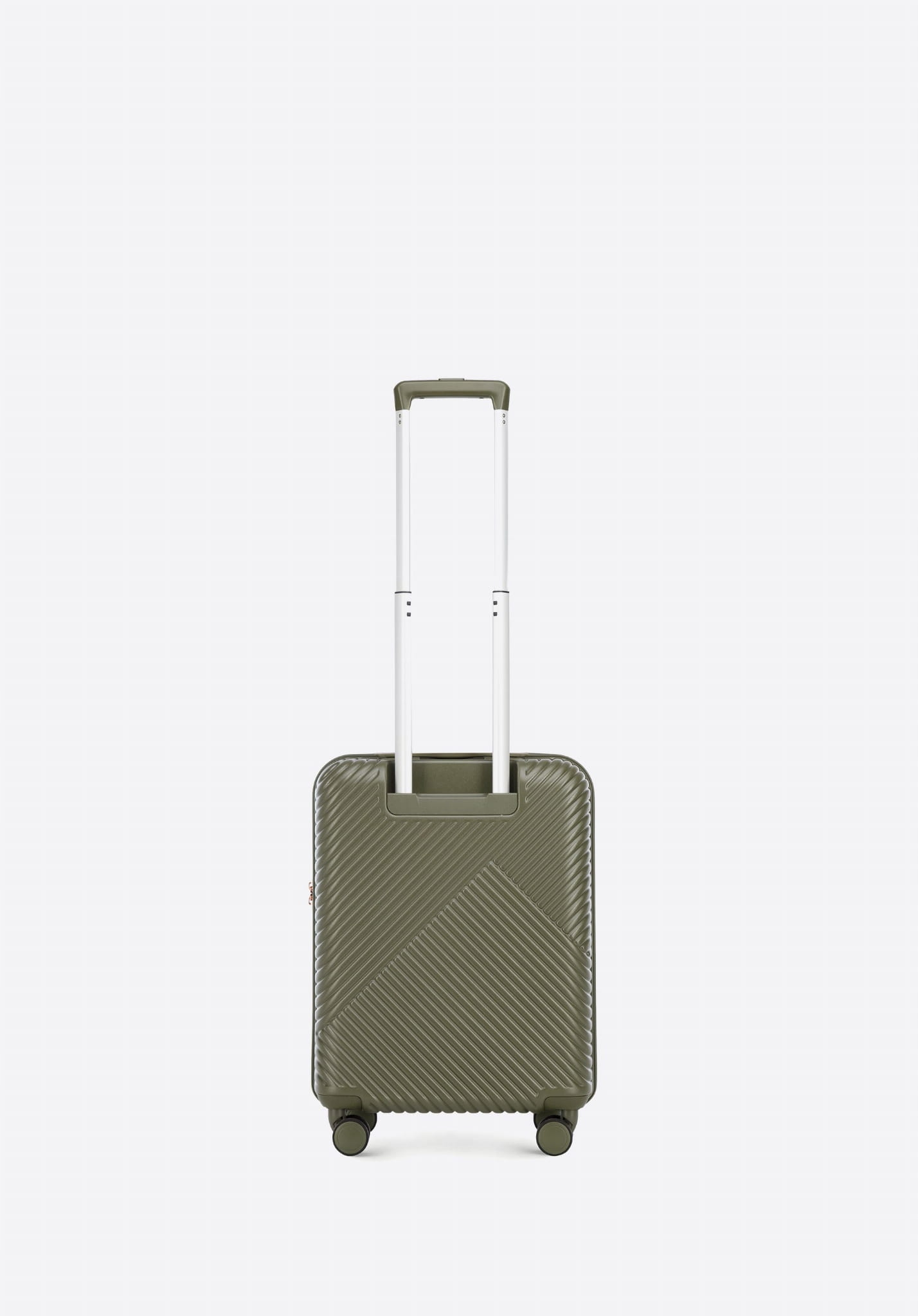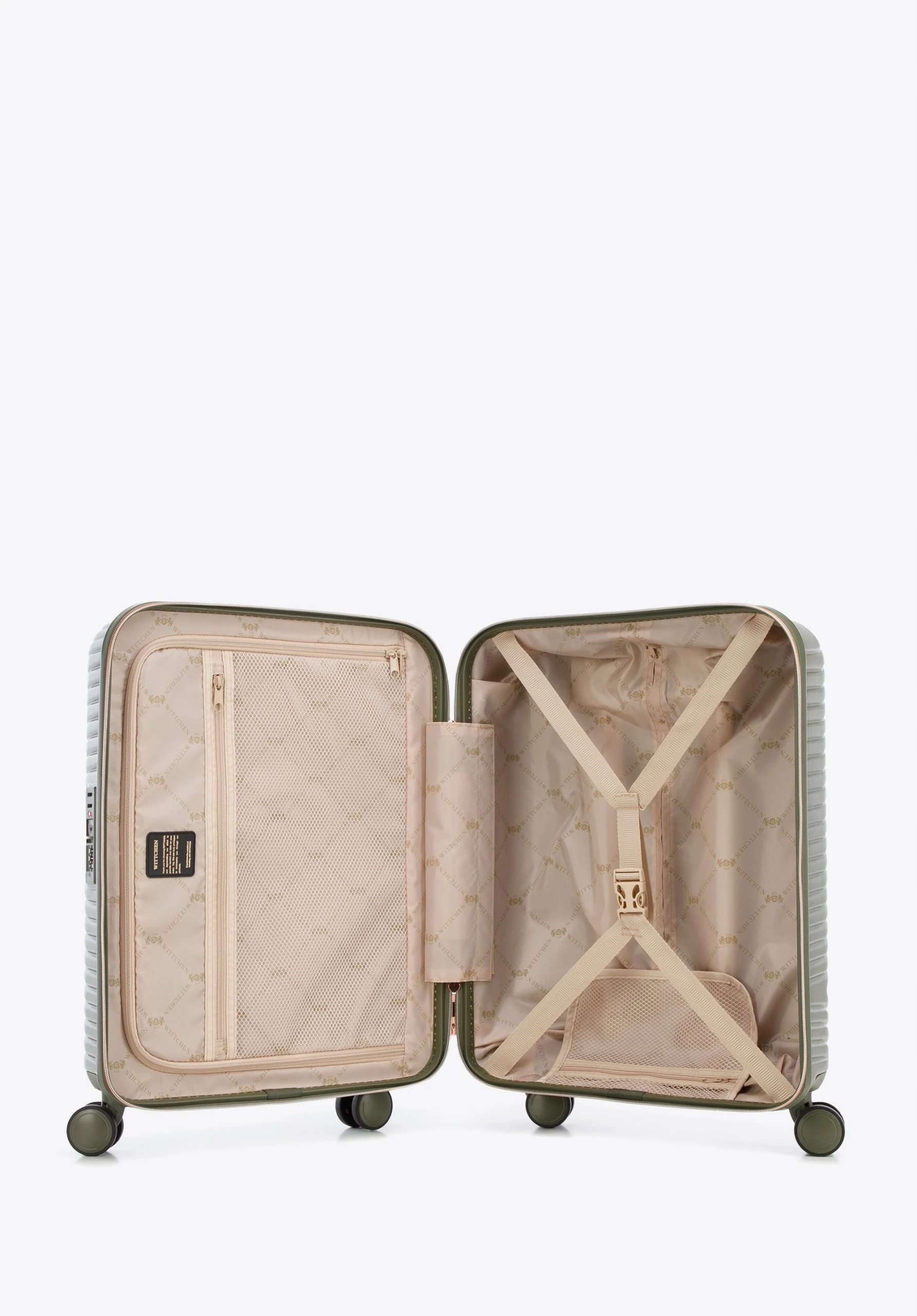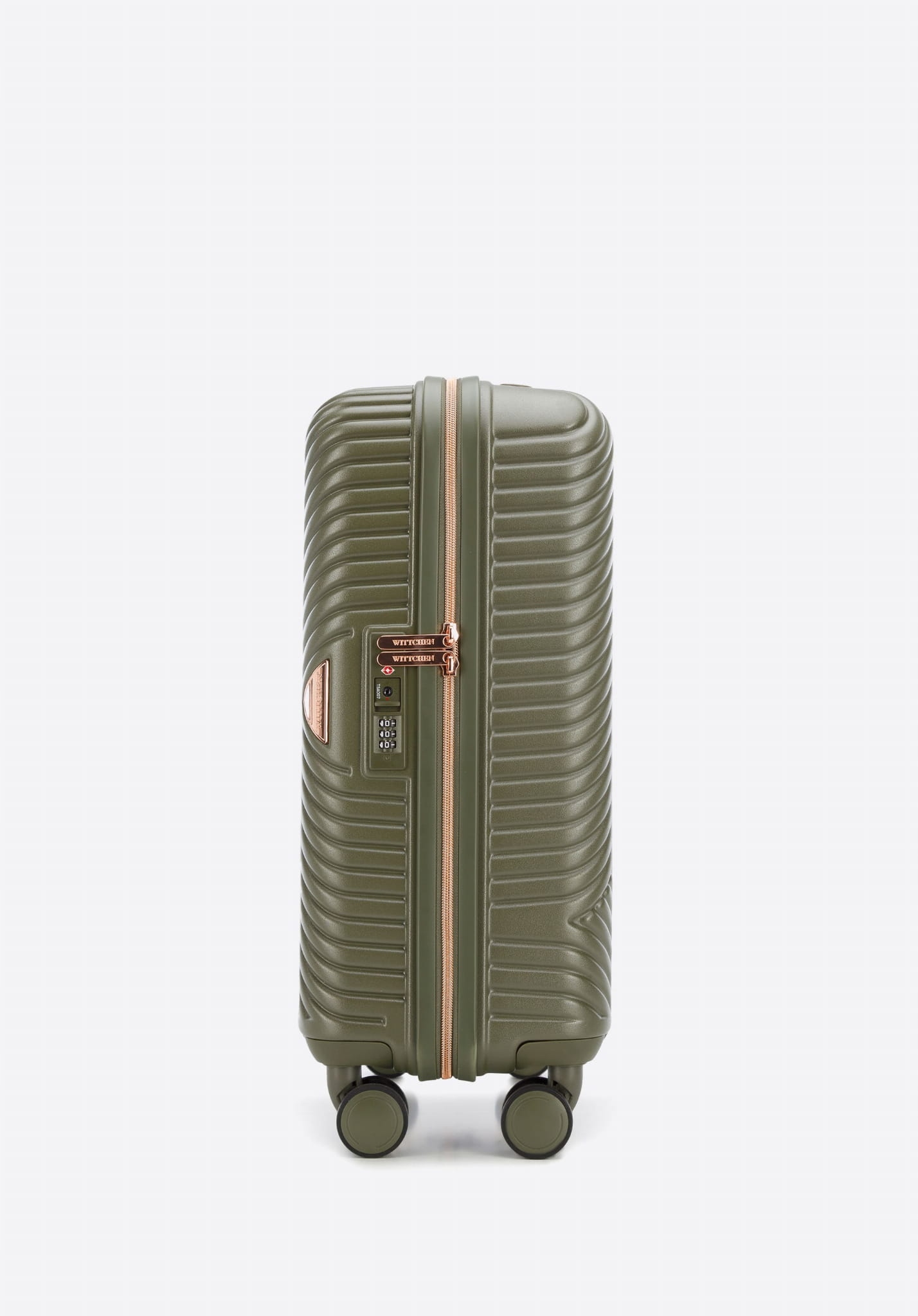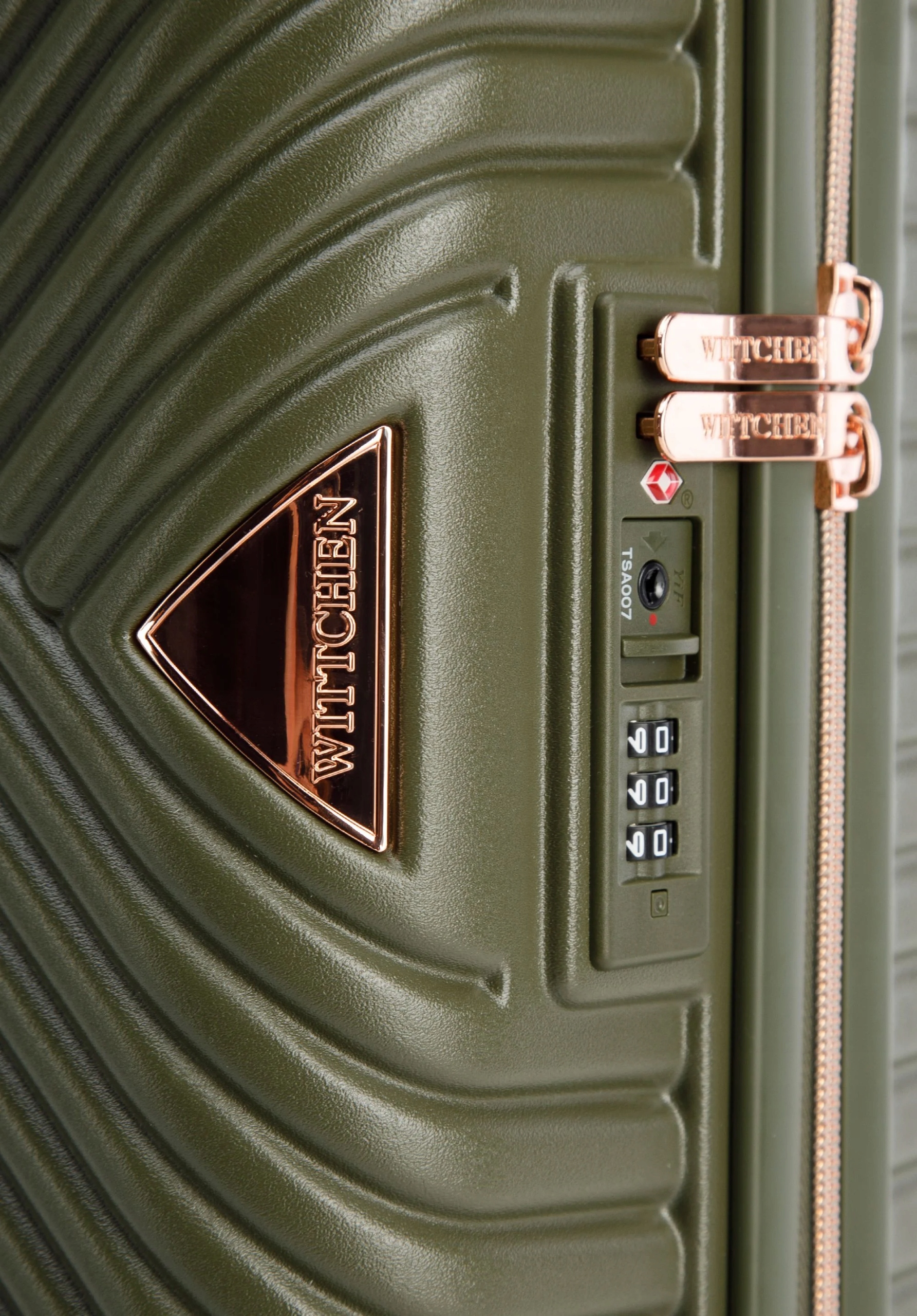 Валіза WITTCHEN 56-3P-841-85з колекції GL Style оливкового кольору, виготовлена з полікарбонату з матовим покриттям. Валіза відповідає вимогам ручної поклажі більшості бюджетних авіакомпаній (Easy Jet, LOT, Lufthansa, Wizz Air). Оснащений чотирма подвійними колесами, виготовленими з ABS-пластику і покритими термопластичним покриттям, алюмінієвою телескопічною ручкою з замком і гумовою гнучкою ручкою. Всередині є відділення з регульованими лямками для захисту багажу від переміщення, відділення, що закривається на блискавку, і 3 кишені на блискавці, в тому числі 2 сітчастих. Безпека у вигляді замка TSA є додатковою перевагою. Завдяки йому під час митного огляду багажу ми маємо гарантію неінвазивного відкриття валізи та її повторного закриття, без пошкодження замка. Завдяки невеликим розмірам валіза легка, але містка і практична.