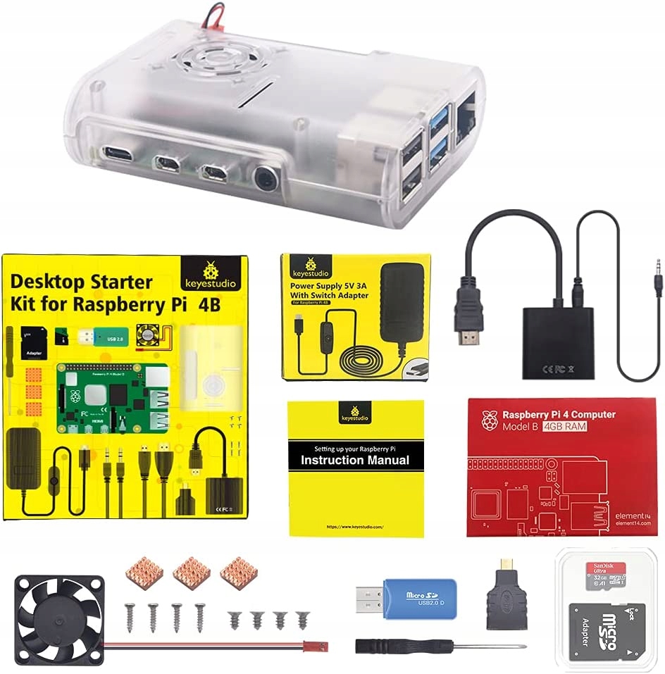 KEYESTUDIO Case для Raspberry Pi 4 з корпусом, видимим акриловим вентилятором, алюмінієвим охолодженням, радіатором, картою MicroSD, блоком живлення USB-C Чохол Pi 4b, сумісний з Raspberry Pi 4 модель B 4 ГБ