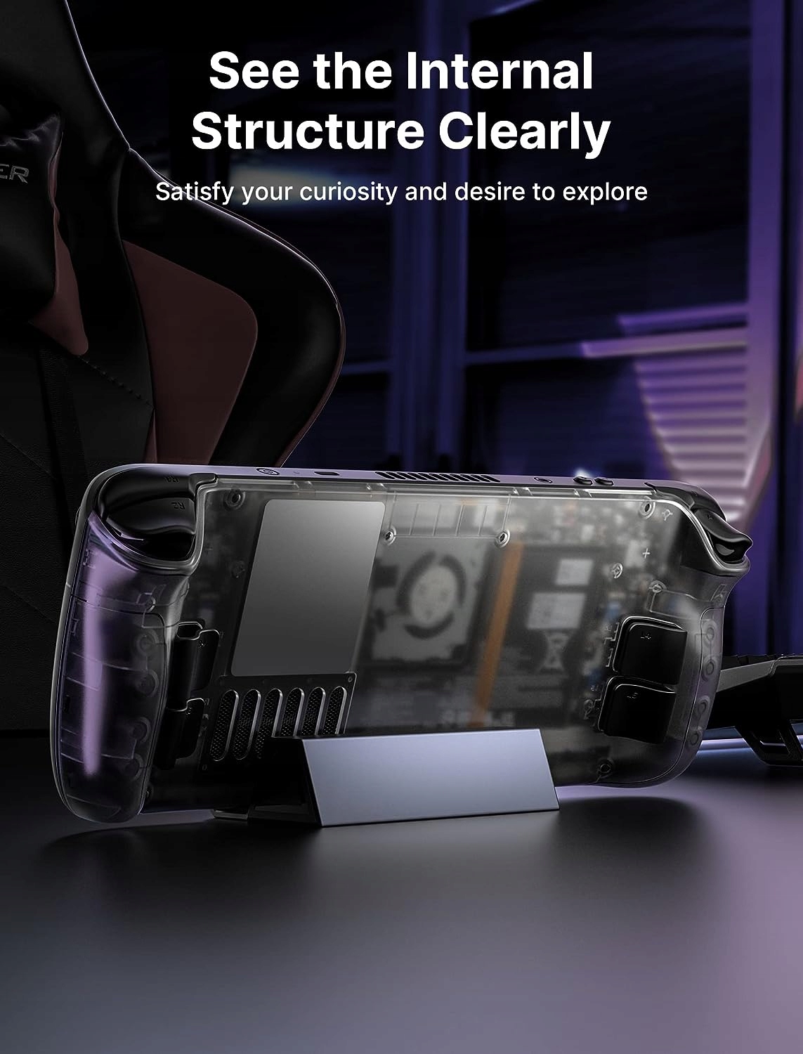 Ця прозора задня кришка дає змогу бачити все апаратне забезпечення Steam Deck. Завдяки прозорій пластині ви зможете ідентифікувати кожен найдрібніший елемент свого мобільного пристрою, зберігаючи унікальний зовнішній вигляд.