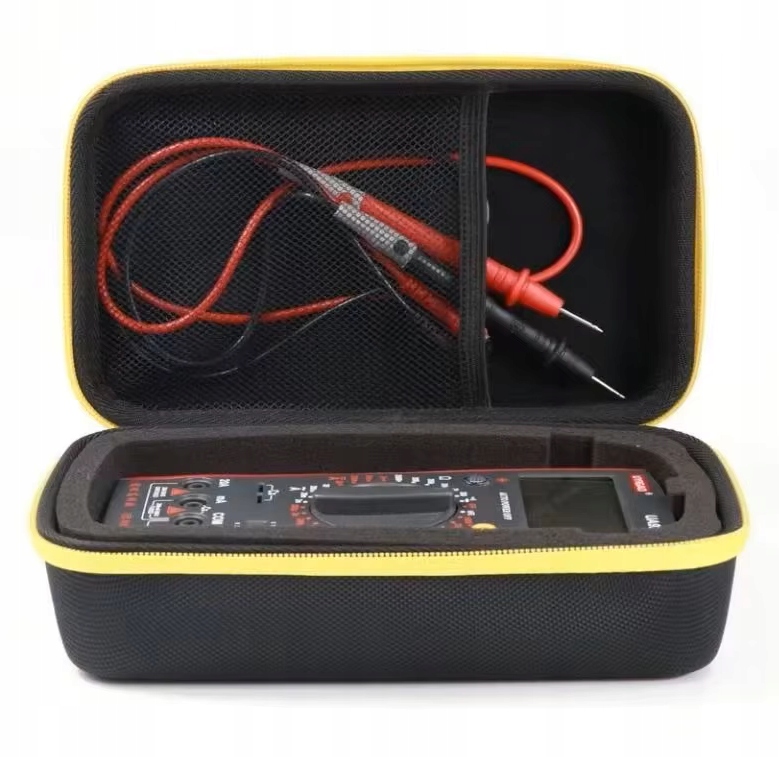 Соцільний чохол для мультиметра - це практичний і надійний аксесуар, який ідеально підходить як для роботи, так і для повсякденного використання. Сумка виготовлена з міцного та водонепроникного матеріалу EVA, який ефективно захищає пристрій від вологи, ударів та інших механічних пошкоджень. Закривається на міцну блискавку і оснащена зручною ручкою для перенесення, гарантує комфорт використання в будь-яких умовах. Внутрішня частина чохла була розроблена з урахуванням безпеки обладнання - спеціальне формування стабілізує глюкометр, а гнучка сітчаста кишеня дозволяє зберігати вимірювальні щупи або дрібні аксесуари.