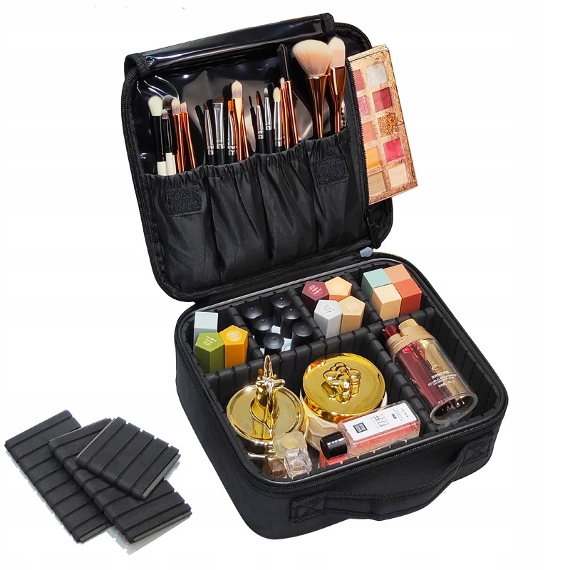 - твердий, виготовлений з міцного матеріалу: Косметика з макіяжу тканини в Оксфорді : помада, туш, олівці для очей або брів, вкладиші для губ та щітки та ті трохи більші креми, бальми або невеликі електричні пристрої, такі як епілятори тощо. Система регульованих відсіків може бути адаптована до розмірів розділів всередині багажника.