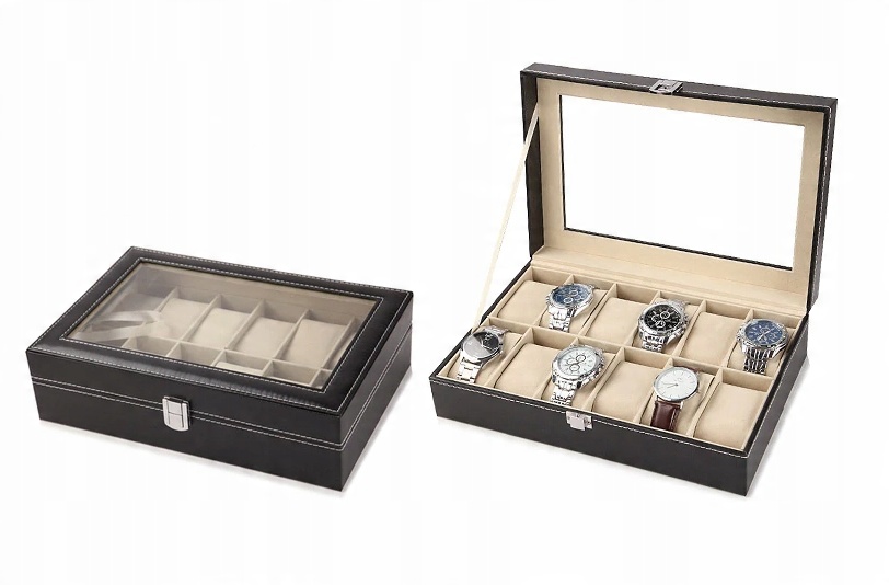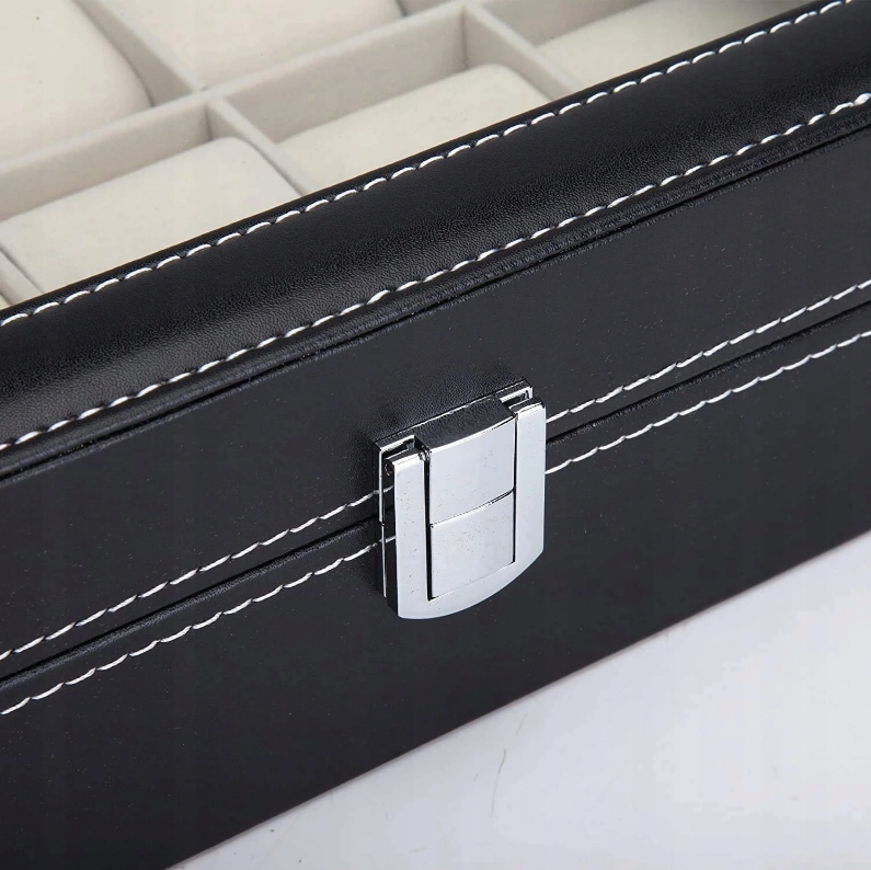 Елегантна коробка для годинника має цілих 12 відділень, в які можна розмістити не тільки годинник, а й інші прикраси. Касета має елегантний чорний колір і видимі світлі шви, що додає елегантності та стилю всьому. Кришка корпусу годинника прозора (скляна), тому коробку для годинника можна використовувати не тільки для зберігання, а й для вишуканої демонстрації вмісту.