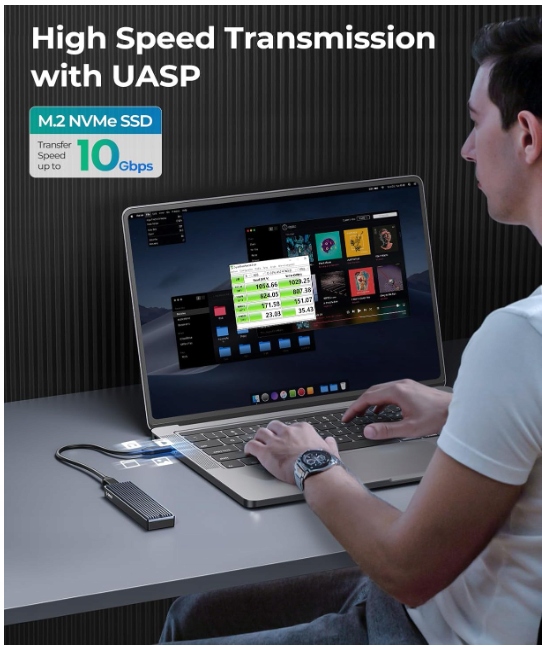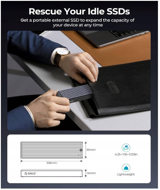 Корпус ORICO M.2 SSD дозволяє використовувати диск M.2 NVME як зовнішній корпус (наприклад, портативний SSD) лише через USB-порт комп’ютера чи ноутбука.
