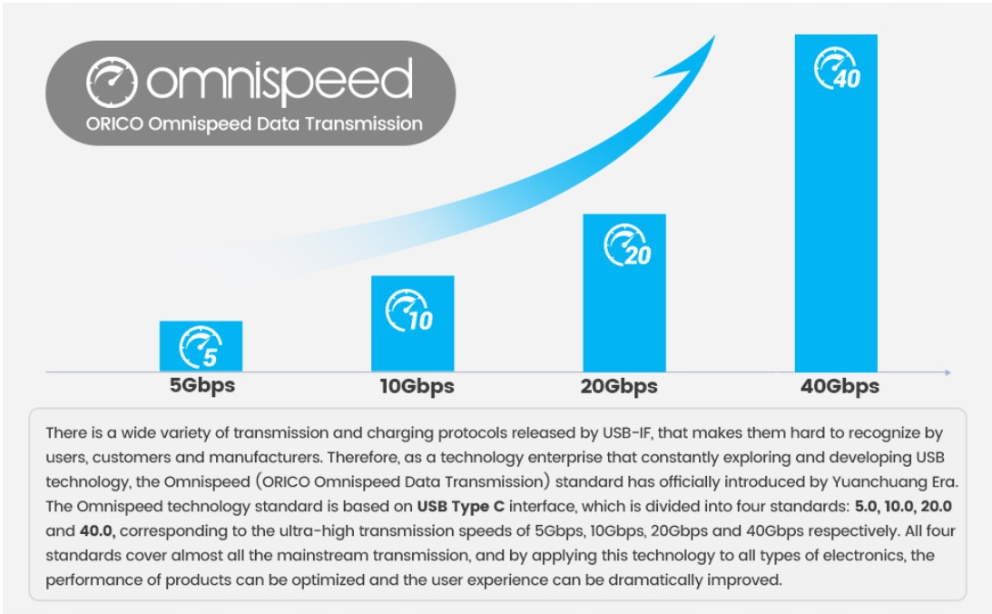 Стандарт технології Omnispeed базується на інтерфейсі USB Type-C, який поділяється на чотири стандарти: 5.0, 10.0, 20.0 і 40.0, що відповідає дуже високій швидкості передачі 5 Гбіт/с, 10 Гбіт/с, 20 Гбіт/с або 40 Гбіт/с. Усі чотири стандарти охоплюють майже всю головну трансмісію, і, застосовуючи цю технологію до всіх типів електроніки, можна оптимізувати продуктивність продукту та значно покращити взаємодію з користувачем.