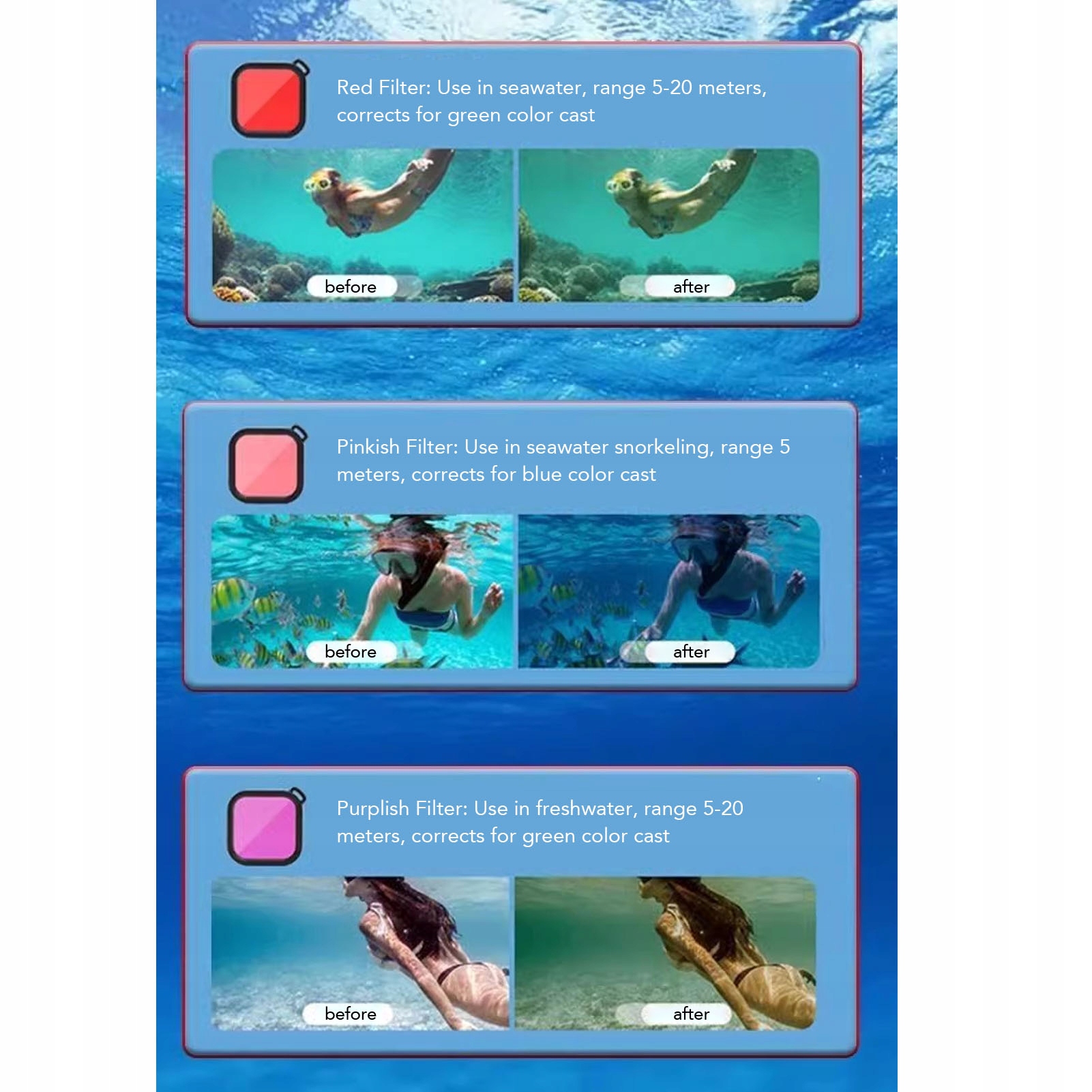1. Сумісність: спеціально розроблена для дії 5 Pro, для дії 4, а також для дайвінг -камер дій пропонує широку сумісність, завдяки якому вона підходить для серфінгу, дайвінгу, реву, катання на лижах, стрибках та інших водних заходів