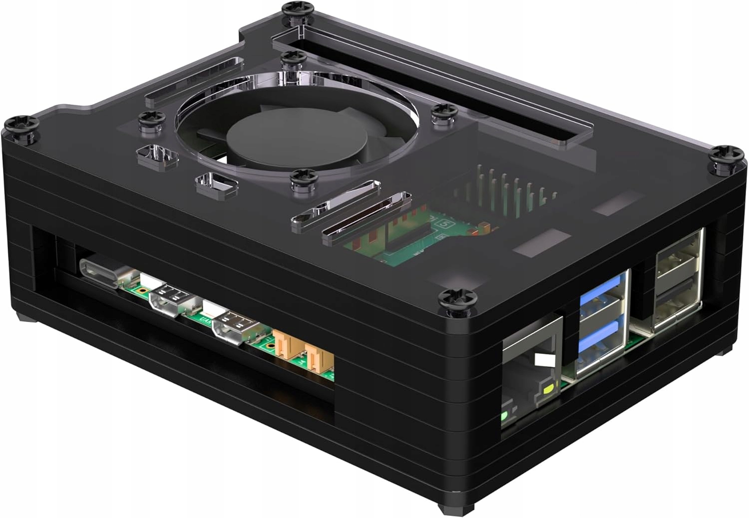 - 1 x корпус для Raspberry Pi 5, 1 x PWM вентилятор охолодження 40 x 40 x 10 мм; 1 набір із 4 мідних радіаторів; 5 чорних болтів і гайок; 4 гумові накладки, інструкція.