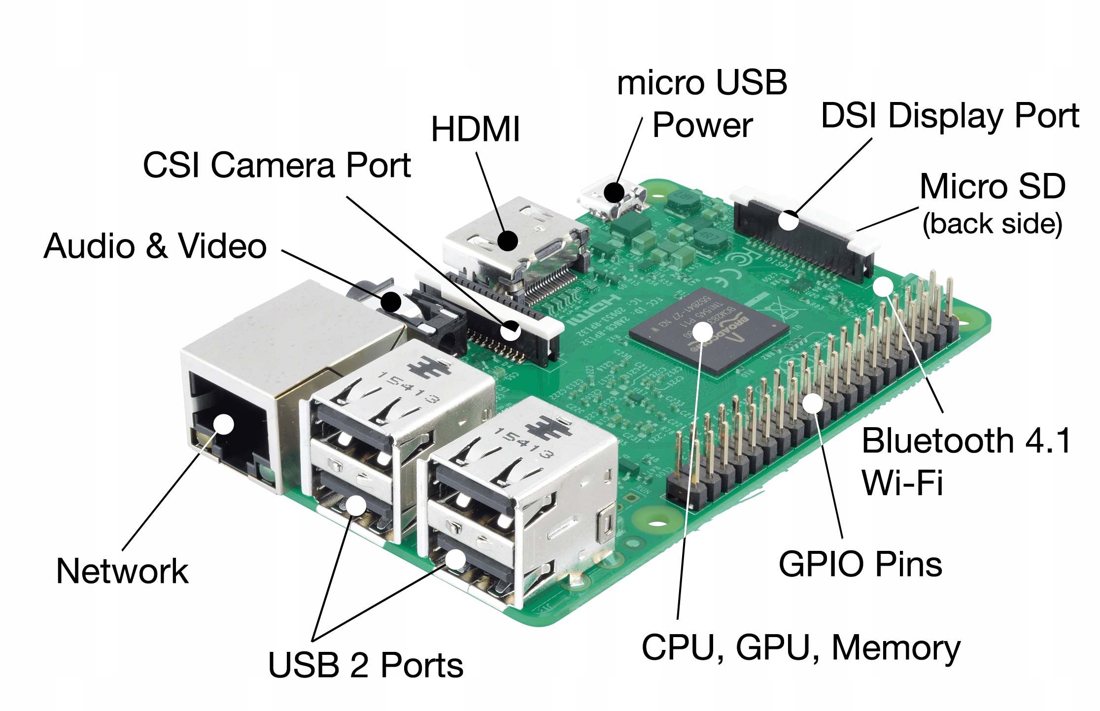 - Інтерфейси: HDMI, аналоговий аудіо-відеороз'єм 3,5 мм, 4 x USB 2.0, Ethernet, CSI - Послідовний інтерфейс камери, DSI - Послідовний інтерфейс дисплея