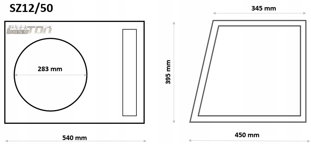 Корпус гучномовця з фазоінвертором. Повністю виготовлений з МДФ товщиною 18 мм. Отвір під дві колонки діаметром 30 см, об'ємом - 50 л. Колір оббивки: Чорний -