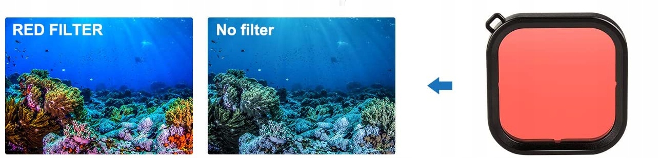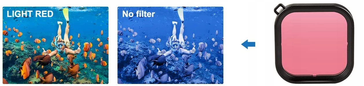 Світло-червоний і червоний фільтри забезпечують відповідну корекцію відповідно на менших і більших глибинах у морській воді, синій воді, а пурпуровий чудово підходить для для прісної, зеленої води.
