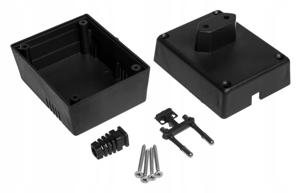 Двокомпонентний корпус KRADEX Z21 для блоку живлення, розміри 82 x 64 x 55 мм. У корпусі встановлена заглушка. Корпус містить гвинти, запобіжник натягу та штифт.