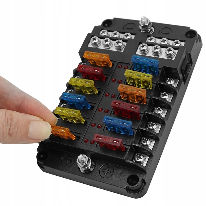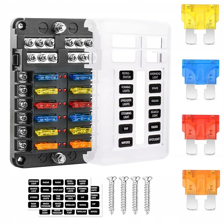 коробка | запобіжники | корпус | гніздо | 12-польовий | 12 В | універсальний | негативна рейка | до автомобіля | із наклейками та гвинтами