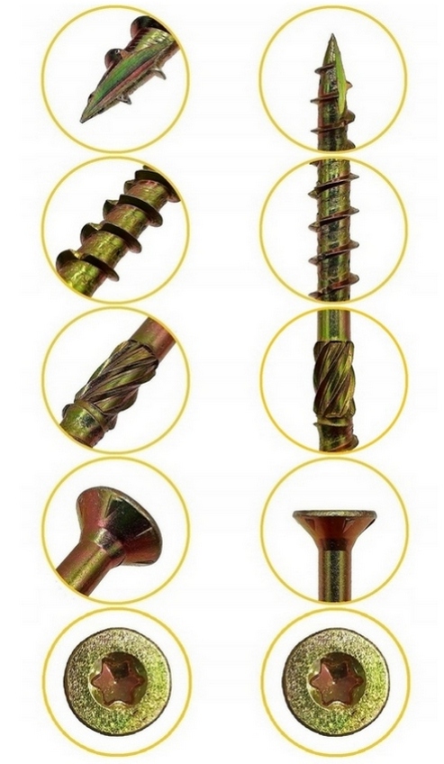 Шурупи призначені для з'єднання дерев'яних і дерев'яних елементів (ДСП, фанера, дерево, ОСБ, МДФ). Інноваційний дизайн робить роботу з ними суцільним задоволенням.Конструкційний гвинт виготовлений з низьковуглецевої сталі. Елемент стійкий до таких факторів, як зсув і розрив. Вони не вимагають попереднього свердління. Розріз на початку різьби значно полегшує початкове складання. Завдяки цьому деревина не розтріскується. Таке рішення дозволяє монтувати в місцях, де неможливо точно притиснути елемент. Глибока та стійка головка TORX ефективно передає крутний момент без ефекту висувного біта. Фреза, розташована в середині гвинта, розширює отвір, завдяки чому кріплення вимагає використання на 20% менше зусилля.