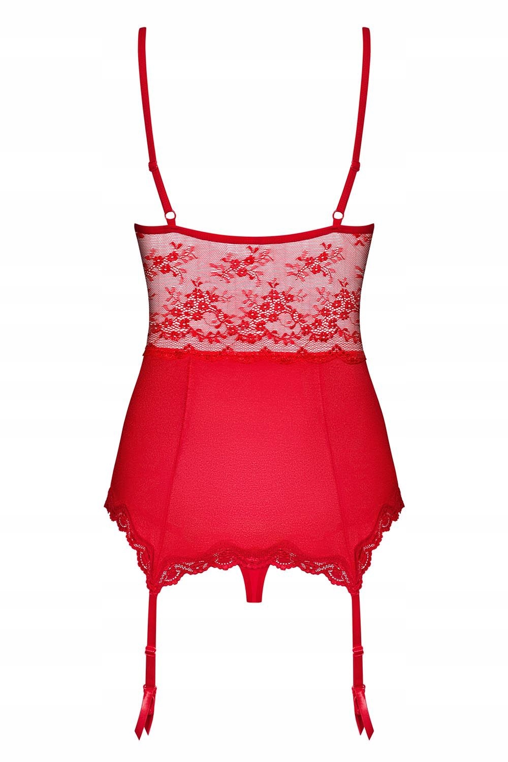 Красивий і сексуальний червоний корсет з сітчастими вставками, прикрашений ефектним мереживом. М'які чашки на кісточках, оброблені мереживом. Між ними — блискуча, ювелірна підвіска. Регульовані бретелі. Корсет в поєднанні з регульованими підв'язками. У комплект входять сексуальні класичні стрінги. Гнучкий, облягаючий матеріал (95% поліамід, 5% еластан)