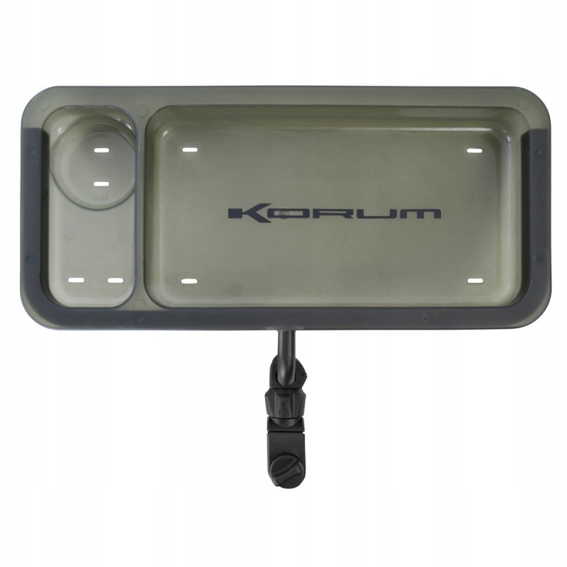 Компактна бічна підставка, призначена для стільця з аксесуарами Korum. Дно з розсувною перфорацією запобігає накопиченню води. Піддон вміщує дві великі ємності з приманкою. Він також має додаткову поверхню, куди ми можемо помістити наживки, гаманці з поводками або менші аксесуари, необхідні для риболовлі.