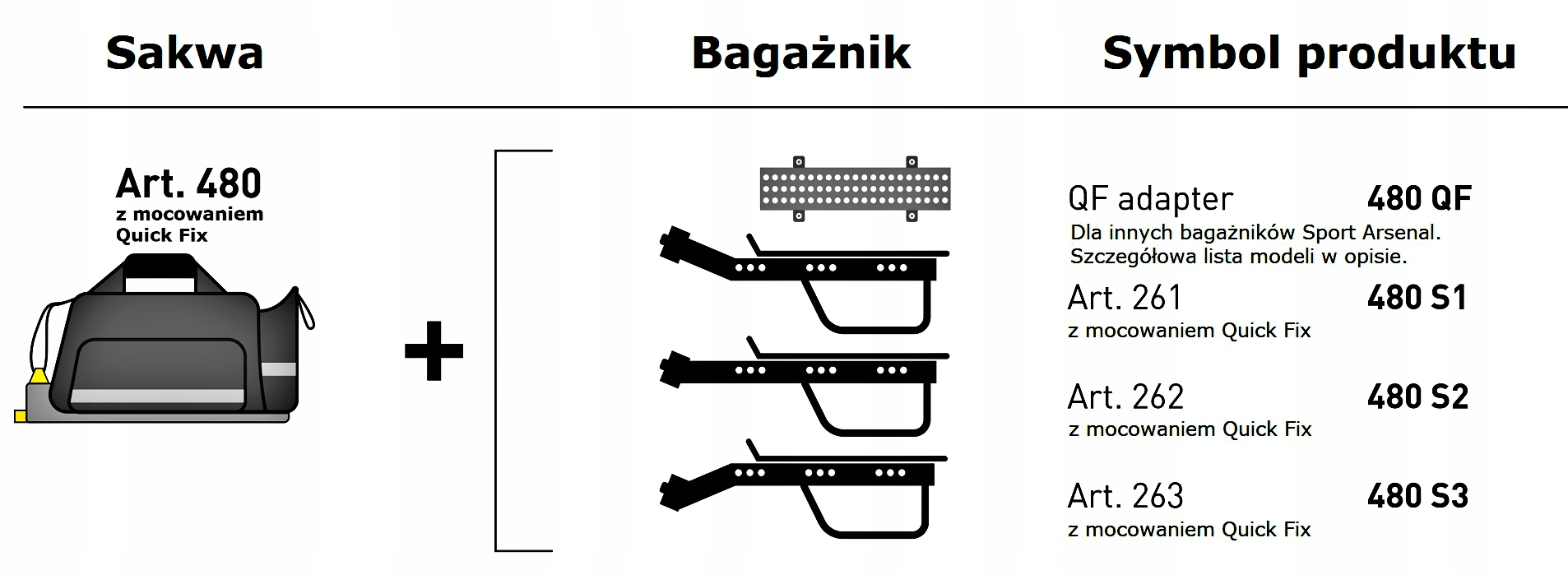 - QF (комплект багажника з кріпленням QuickFix + адаптер QF для встановлення на стійки Sport Arsenal: