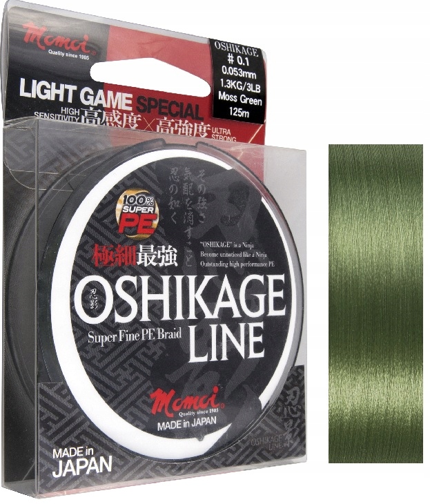 Через специфіку плетеної волосіні з мікрофібри неможливо точно визначити діаметр. Така волосінь, навіть якщо вона ідеально кругла на правильно намотаній котушці, завжди буде сплющуватись під час вимірювання, оскільки потім вона більшою чи меншою мірою подавлюється. Деякі виробники відмовилися від вказівки діаметра і задали лише міцність, інші взяли на озброєння принцип опису діаметра, заснований просто на візуальному сприйнятті товщини лінії. Однак японська компанія MOMOI всіх примирила. Вона приготувала косу Oshikage, діаметр якої настільки неймовірно малий, що відмінність від будь-якої іншої лінії відразу видно неозброєним оком. Такі діаметри раніше були доступні лише для нейлонових шнурів, але, звичайно, з набагато меншою міцністю. Додавши до цього дуже точне, щільне плетіння та чудову гладкість поверхні, рибалка отримує справді новаторський продукт, який дозволяє йому вивести легкий спінінг на таку рибу, як окунь, язь, головень або форель, на новий рівень.
