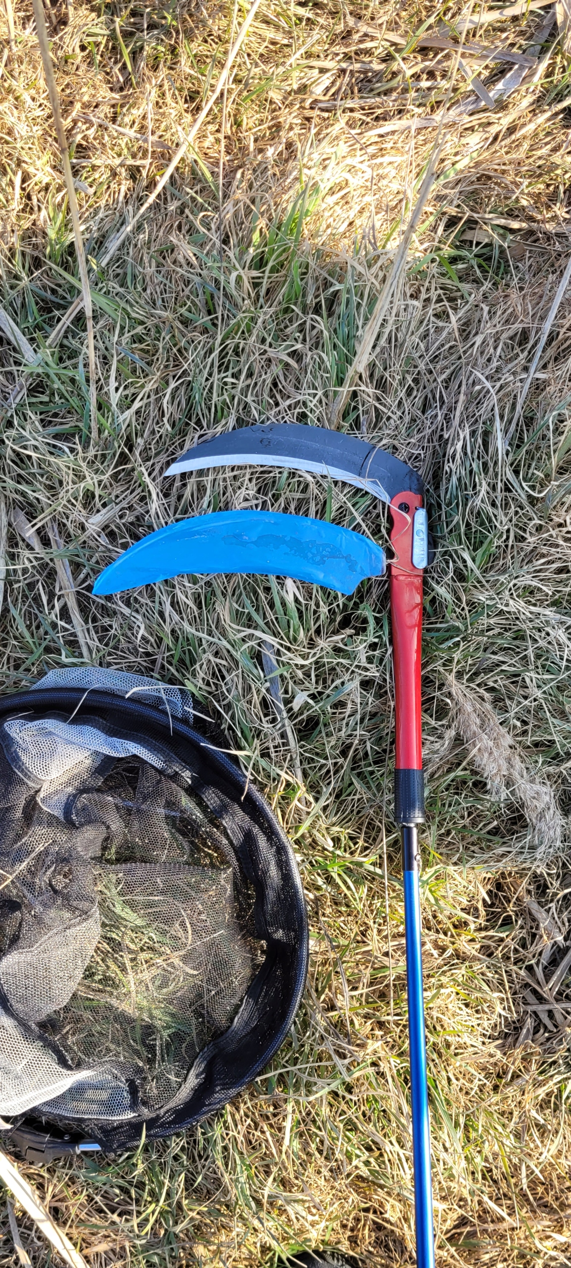 Накручуємо його на жердину як звичайний кошик сачка, висуваємо над поверхнею води, опускаємо лезо за рослиною -