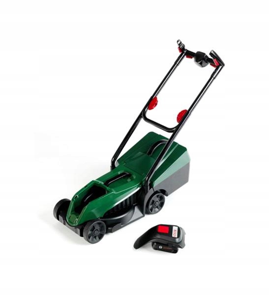 Косарка темно-зелена з чорною ручкою та колесами. Колеса рухливі, тому косарка може пересуватися по різних поверхнях. Відмінною рисою цього обладнання є знімний світлозвуковий модуль, розміщений на передній частині іграшки, де після натискання кнопки в модулі загоряється логотип Bosch, а також він починає видавати дуже реалістичні звуки роботи двигуна та трави. косіння. Модуль працює від батарейок і сумісний з іншими іграшками Bosch (