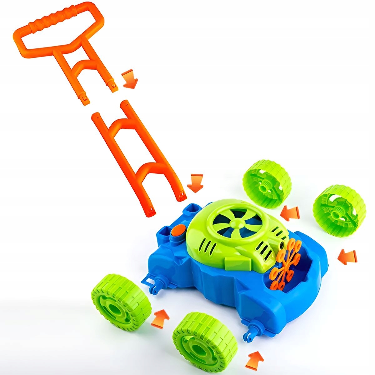 Косарка оснащена 8 кільцями, які занурюються в рідину, коли ви пересуваєте іграшку, а маленький вентилятор, що створює легкий вітерець, змушує вилітати різнокольорові мильні бульбашки.