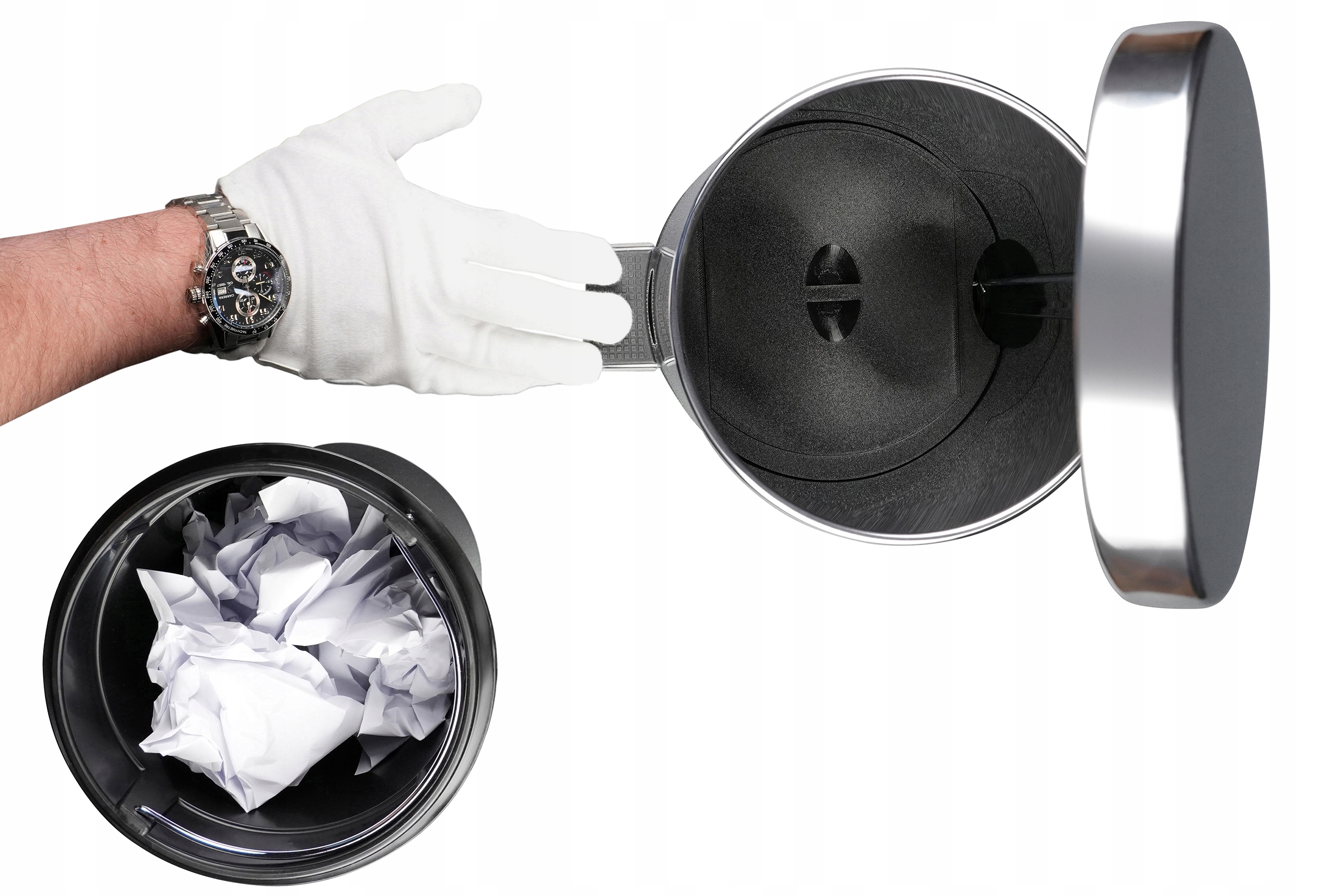 На перший погляд, це класичне відро для сміття з нержавіючої сталі з елегантним хромованим покриттям, ідеальне для будь-якого інтер'єру : санвузол, кухня, вітальня або кабінет. Однак під його подвійним дном приховано щось більше - прихований відсік, який є ідеальним місцем для зберігання грошей, коштовностей, золота, ключів, носіїв даних та інших дрібниць. Завдяки нашому рішенню ви не тільки дбаєте про порядок (функція кошика), а й дбаєте про те, щоб ваші речі були поза досяжністю сторонніх осіб (функція шафки).