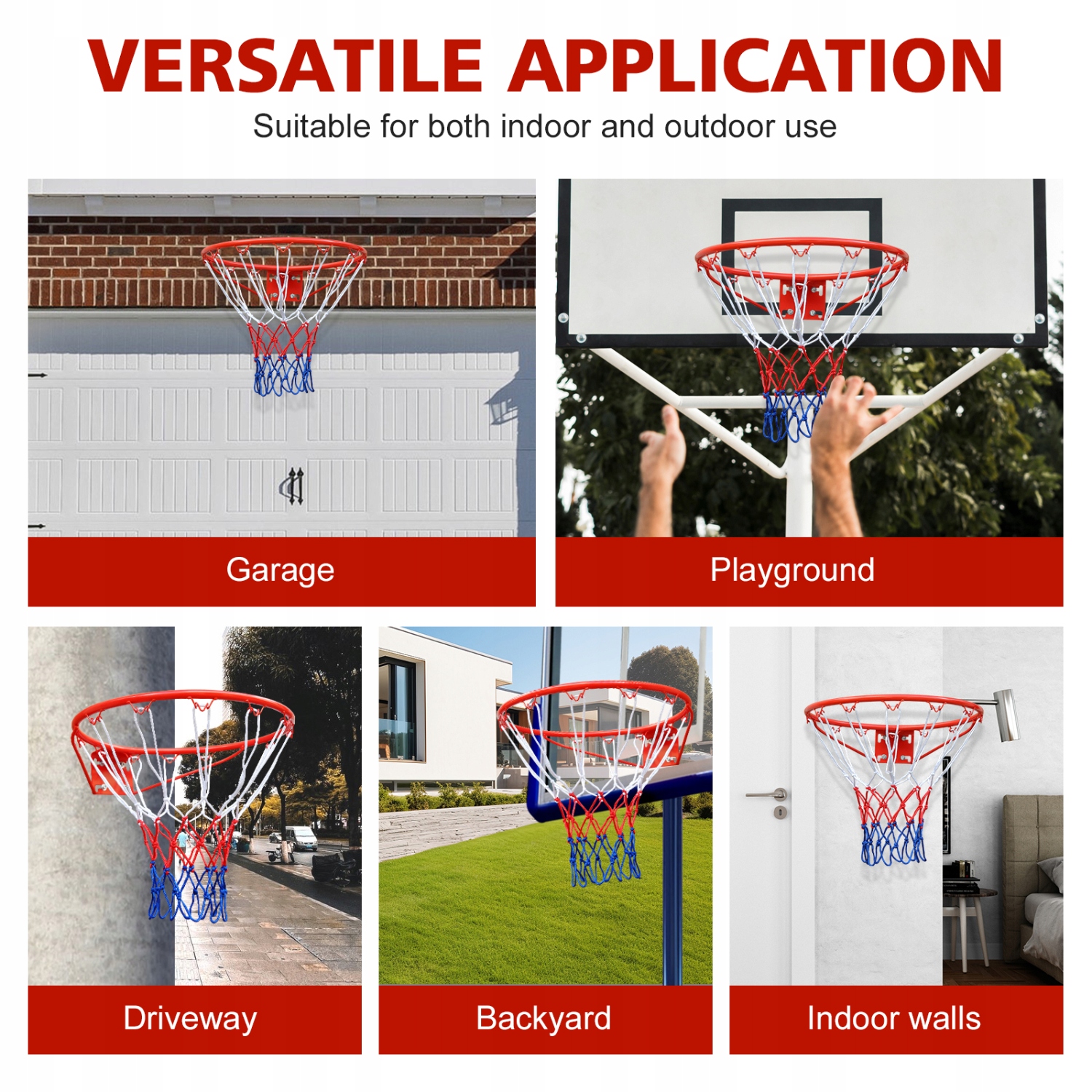 Універсальне використання: це міцне, знімне баскетбольне кільце ідеально підходить як для початківців, так і для любителів баскетболу, будь то на під’їзді, у дворі чи в приміщенні. Його можна встановити на будь-яку стійку вертикальну поверхню, таку як стіна, двері чи інше зручне місце для гри в баскетбол.