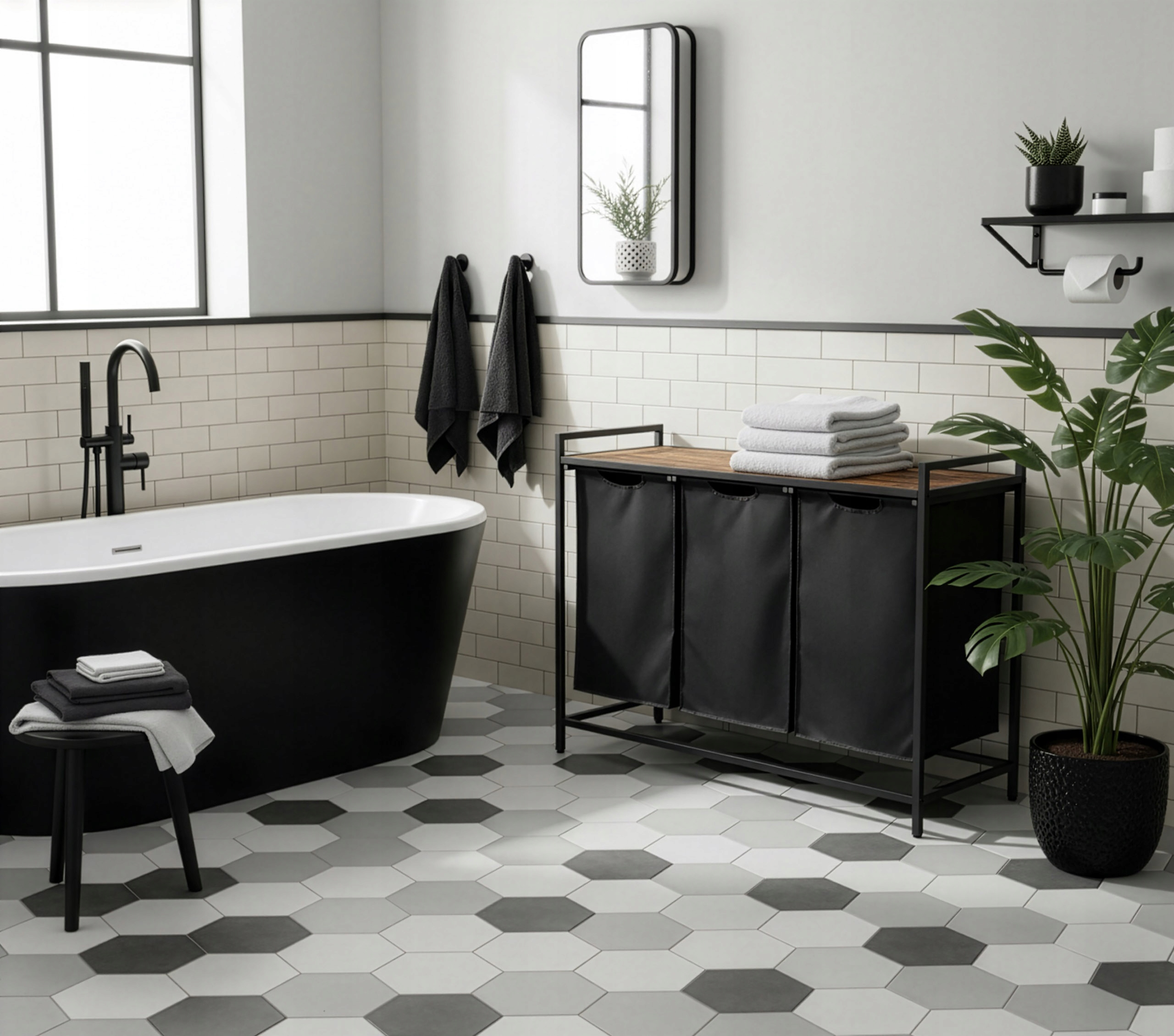 Кошик для білизни Artus з трьома відділеннями - ідеальне рішення для людей, які цінують порядок і функціональність у ванній кімнаті. Його лофт, індустріальний дизайн ідеально вписується в сучасний інтер'єр, забезпечуючи при цьому максимальний комфорт і економію простору. Три окремі камери дозволяють точно розподілити білизну, що полегшує організацію щоденних обов'язків. Крім того, практична поличка над кошиками є ідеальним місцем для рушників і аксесуарів для ванної кімнати. З кошиком Artus ви не тільки збагатите естетику вашої ванної кімнати, але й підвищите її функціональність.