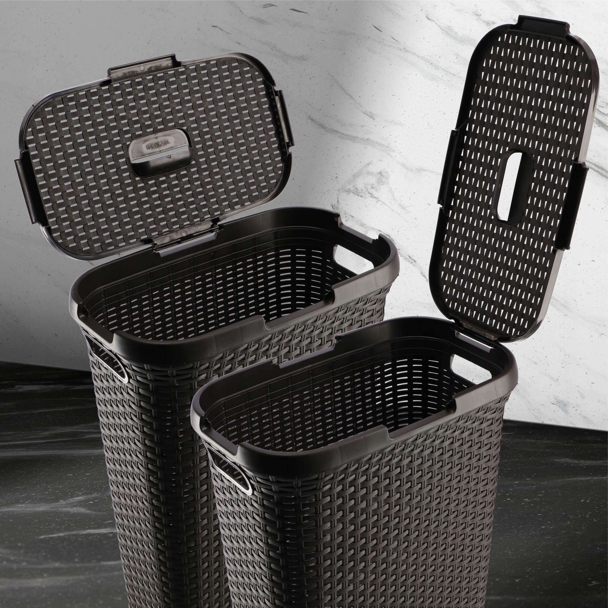 Будьте розумнішими та інвестуйте в практичні рішення! Кришка кошика дуже щільна, тому ви не відчуєте неприємного запаху зсередини. Кошик має отвори, які забезпечують постійний потік повітря всередині, а з іншого боку вони служать ручками для зручного перенесення кошика з його вмістом. Високоякісний матеріал стійкий до подряпин, тому кошик буде прослужить вам роками та довше збереже свій бездоганний стан.