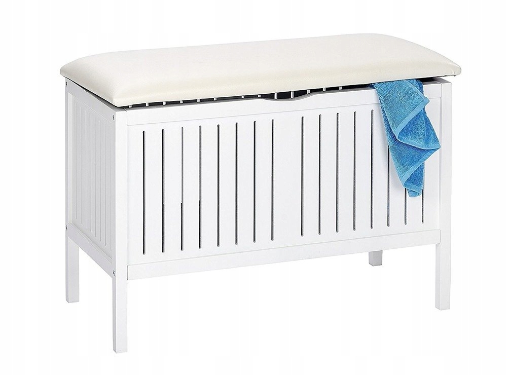 Зручнийпуф з м'яким сидіннямсерії меблів для ванної OSLO. Ідеально підходить для щоденного догляду за обличчям, руками, ногами, а також для макіяжу, сушіння волосся або лосьйону для тіла. Крім того, він також може служити місцем для зберігання одягу, нижньої білизни, білизни, рушників або аксесуарів для купання. Сидіння виготовлено з матеріалу, який легко миється. Модна ребриста конструкція з масиву дерева, пофарбованого в білий колір. Його обов'язково знайдуть застосування у ванній кімнаті, а також в салоні краси або SPA.