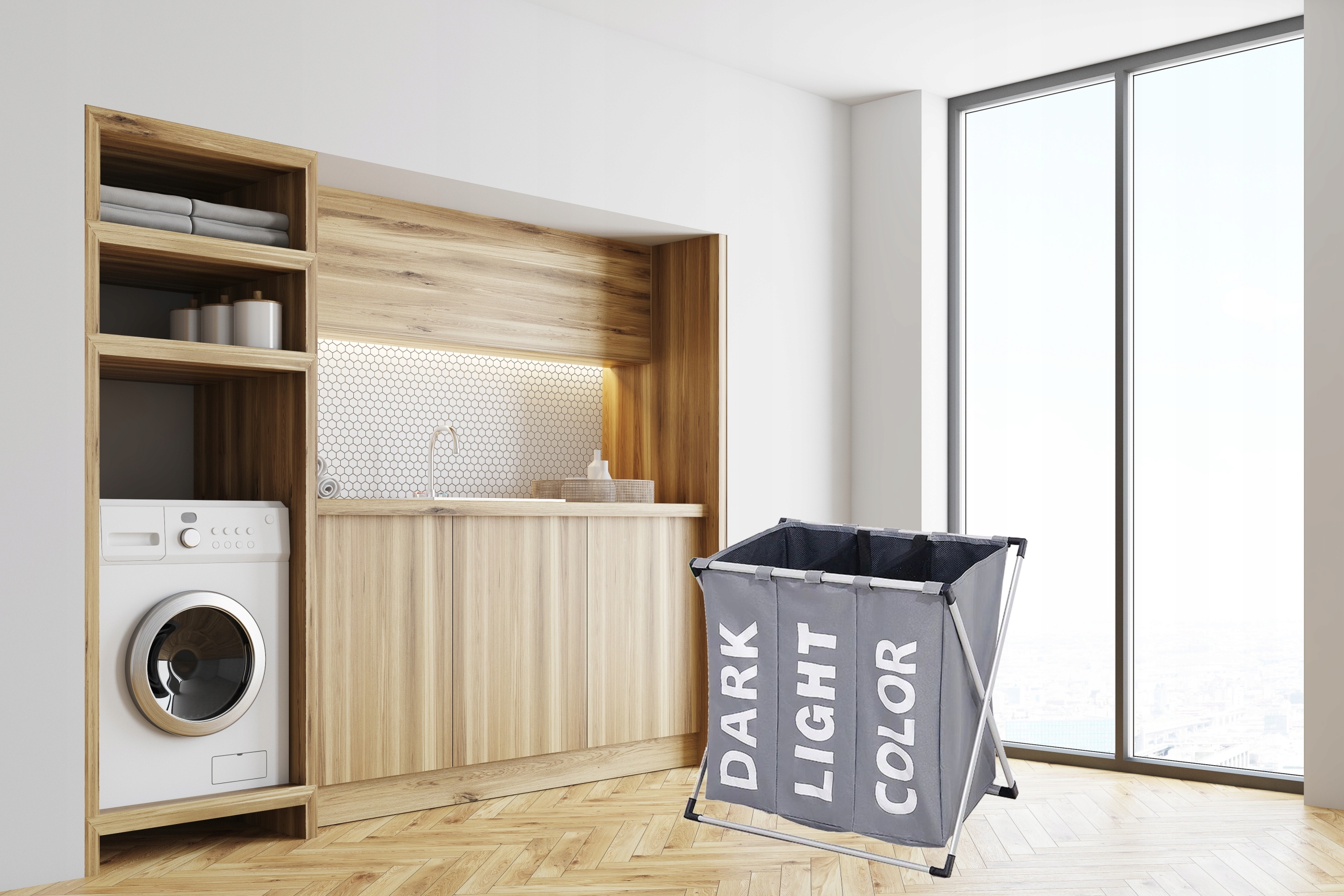 - Кошик для білизни з 3 відділеннями з практичними ручками для перенесення, кріпиться до рами за допомогою липучок