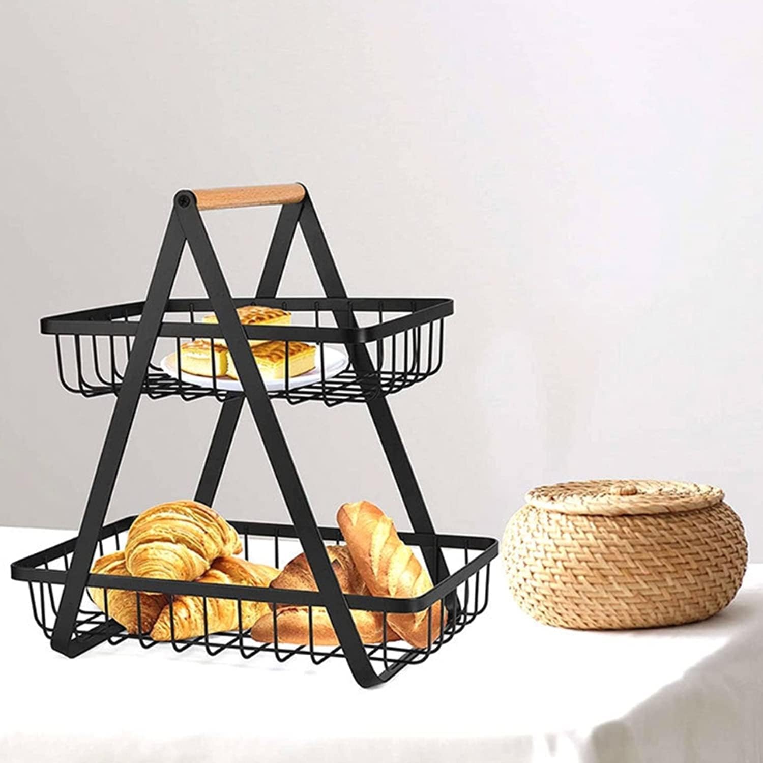 Дворівневий кошик для фруктів і овочів, розміри 27 х 17,5 х 29 см. Нижній кошик має розміри 27 x 17 x 6 см, верхній кошик має розміри 21 x 17 x 6 см. Завдяки йому можна красиво викласти фрукти та овочі на столі. Його також можна використовувати для зберігання дрібниць. Він додасть класичним кімнатам нотку сучасних тенденцій. Він стійкий, практичний і зручний, оснащений зручною ручкою, що полегшує його перенесення. Ідеально підходить для будь-якої кухні та їдальні. Оригінальний продукт Vilde. Виготовлено відповідно до європейських стандартів.