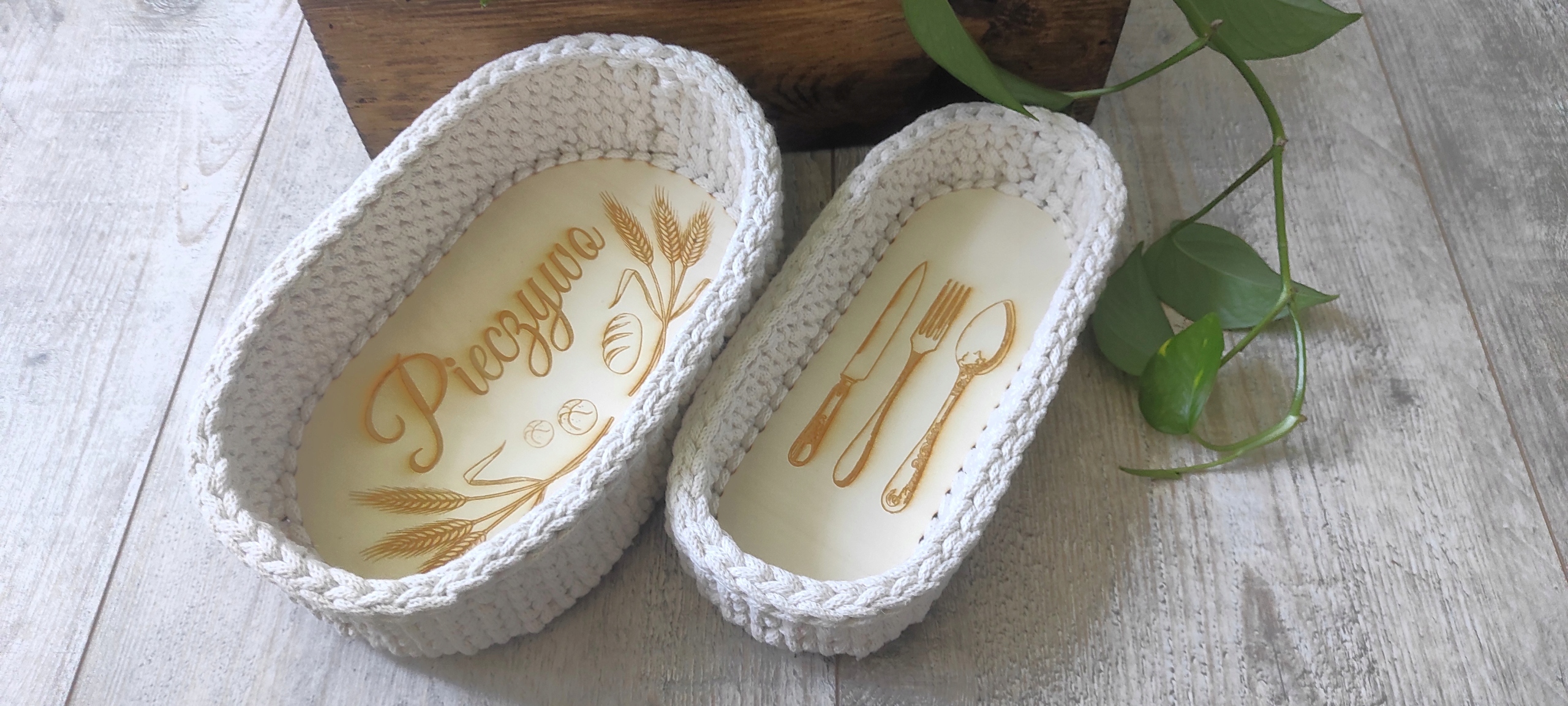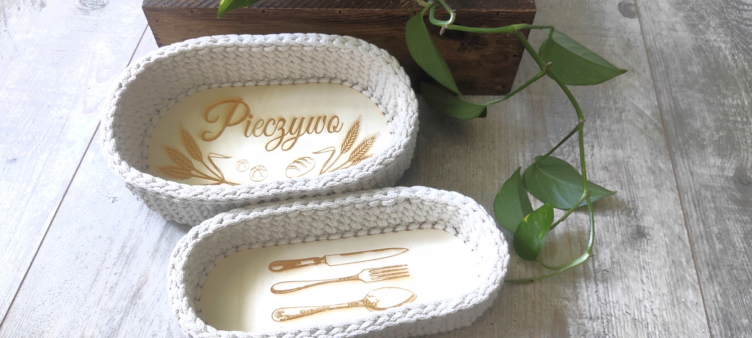 Кошик виготовлено з товстого високоякісного бавовняного шнурка 5 мм, зв'язаного вручну гачком. Дно виготовлено з гравірованої фанери - міцне, елегантне та гігієнічне. Гравірування не тільки додає шарму, але й робить кошик унікальним та єдиним у своєму роді.