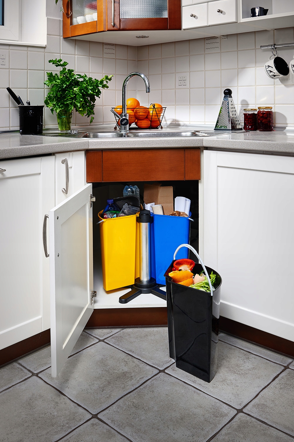 Набір із 3 обертових кошиків для сортування сміття загальною місткістю 36 л. Це кошик для сортування сміття з трьома обертовими контейнерами. p>