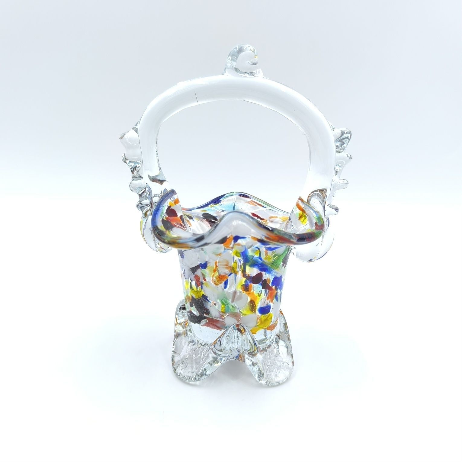 Декоративний скляний кошик у вінтажному стилі, виготовлений із прозорого скла з різнокольоровими плямами, вбудованими в масу - у відтінках червоного, зеленого, жовтого, синього та помаранчевого. Вигадливий край і міцна декоративна ручка надають йому унікальний характер і роблять його привабливою прикрасою інтер’єру.
