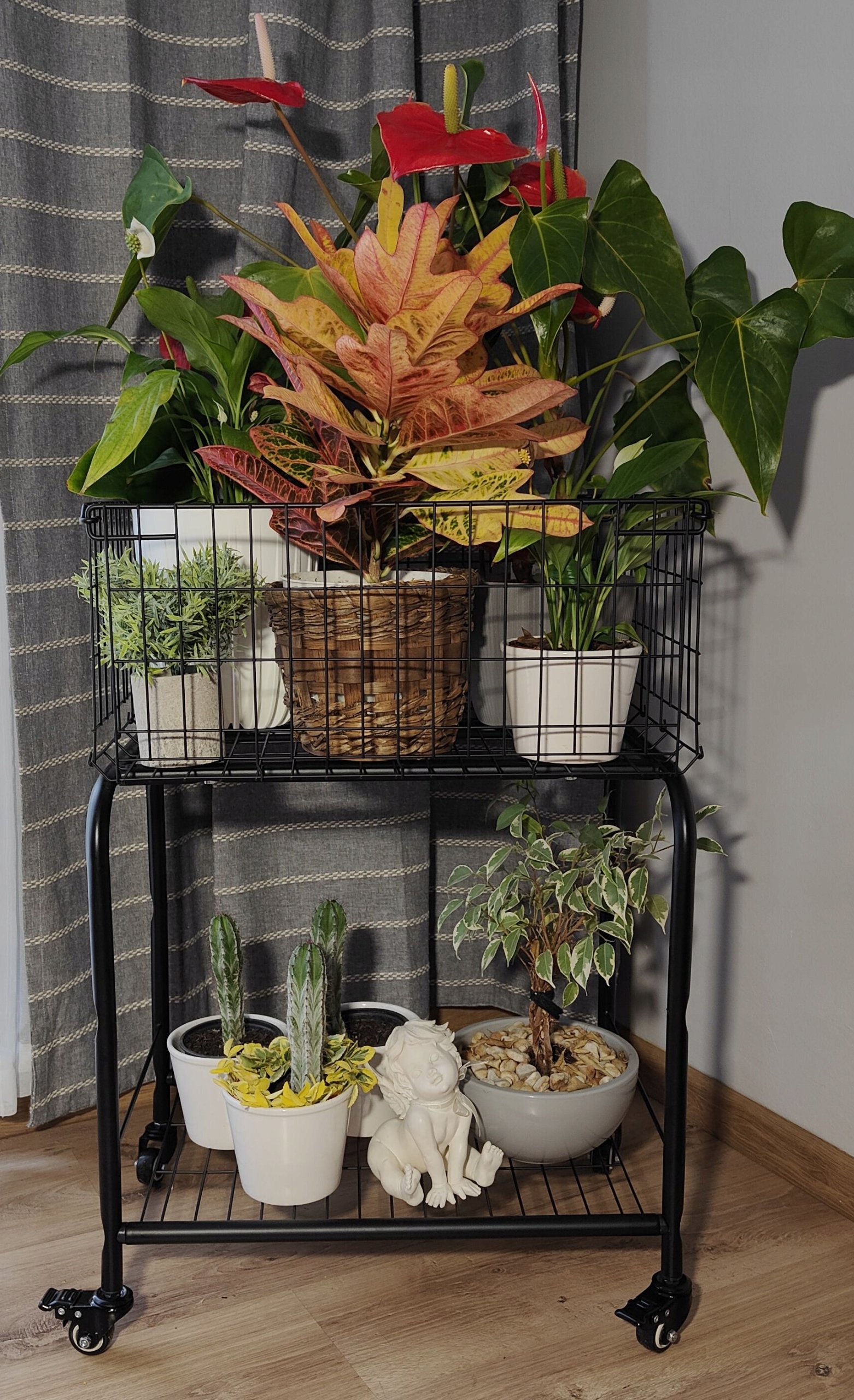 Шафа пересувна, мініполка з дроту та металевої сітки. Ця полиця ідеально підходить для офісу, ванної кімнати, пральні, спальні або вітальні. Має місткий кошик у верхній частині та поличку внизу. Стелаж відмінно впишеться в інтер'єр в стилі лофт або індустріальний. Колеса замикаються з одного боку.