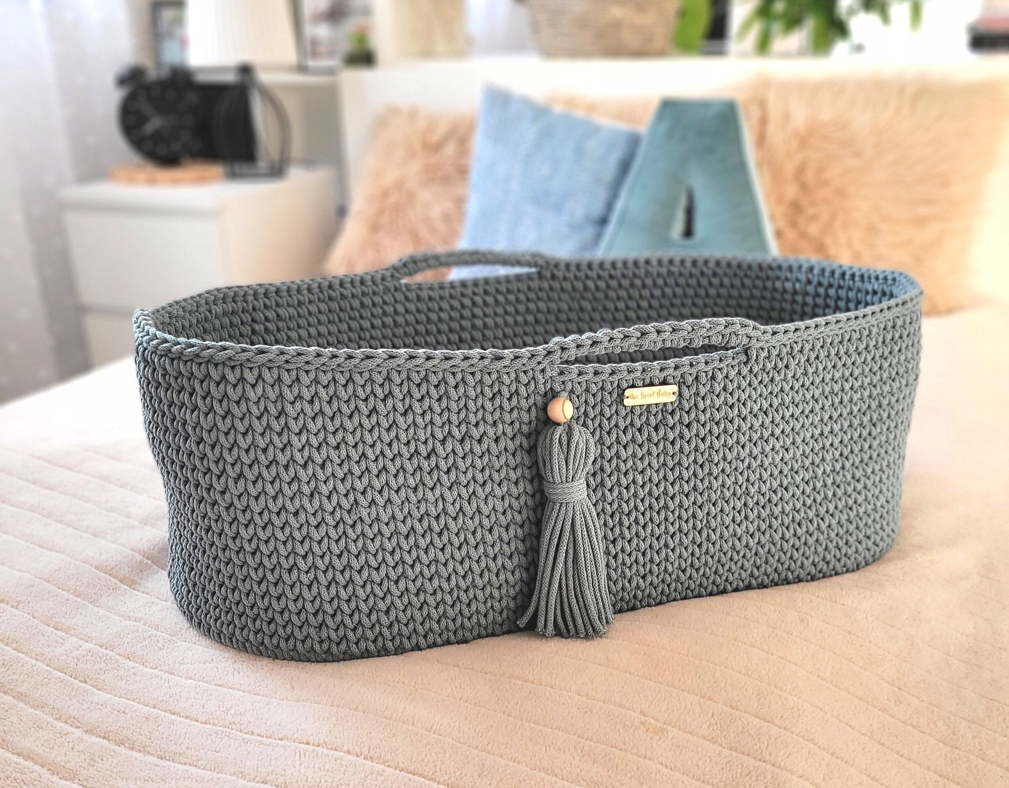 дихаючі. 100% ручна робота- 100% любов і догляд у кожному продукті. М’яке зручне перше ліжко для новонародженої дитини. Завдяки невеликим розмірам кошик Мойсея може супроводжувати батьків у кожній кімнаті. Бавовняна струна, з якої тканий кошик м'який, ніжний і в той же час дуже стабільний . Викладання гачком, який використовується в кошику, є трохи відкритою роботою, завдяки якому надається належна циркуляція повітря. Дно кошика виготовлений з суцільної дерев’яної фанери та якості товщиною 6 мм. Включений матрац виготовлений із сертифікованих матеріалів. Матрац наповнений спеціальною нешкільною тканиною, яка жорстко і ізолює дитину знизу. У ручці є красива, гучна китиця ручної роботи в кольорі кошика, прикрашена дерев’яною намистиною.