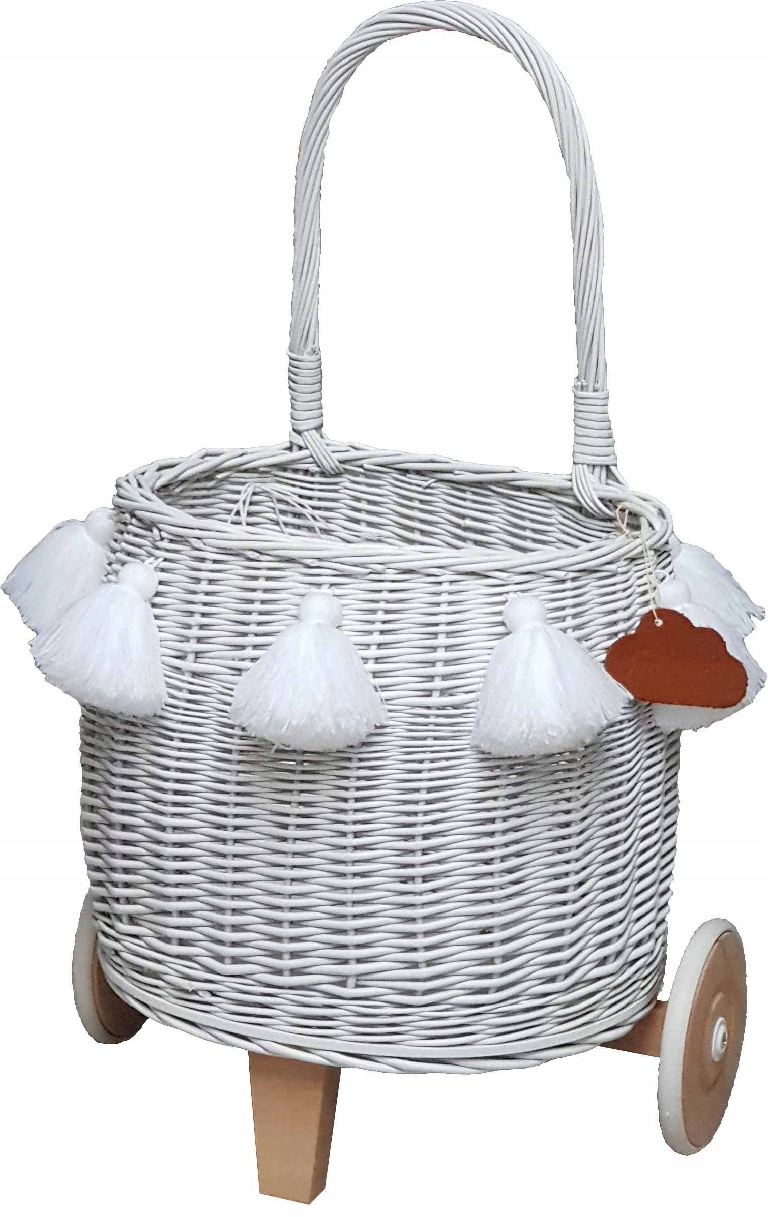 Прекрасний кошик на колесах для ляльок, плюшевих ведмедів. Це чудово підходить для зберігання та транспортування дитячих скарбів, і це буде виглядати красиво. Весь кошик виготовлений вручну з найвищої якості плетеного, від польських ферм. У наших фарбах є сертифікат PZH, і ви можете намалювати дитячі іграшки та меблі.