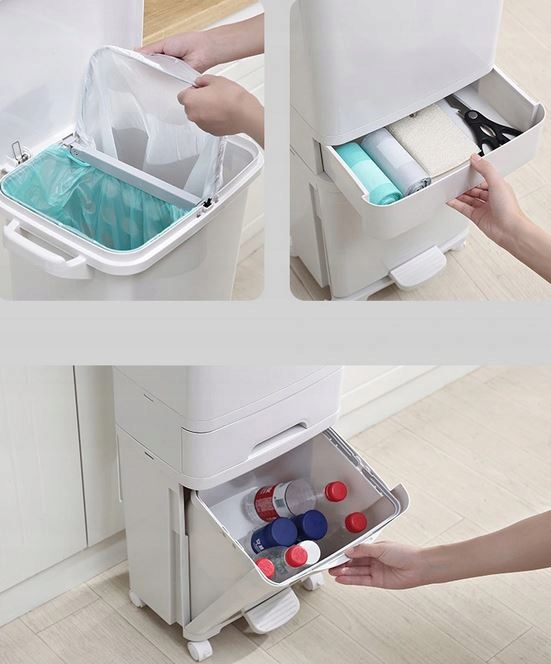 Кошик з кількома відділеннями полегшить розділення сміття. Він не займає зайвого місця в будинку, а завдяки коліщаткам ми можемо легко перемістити його в потрібне місце.