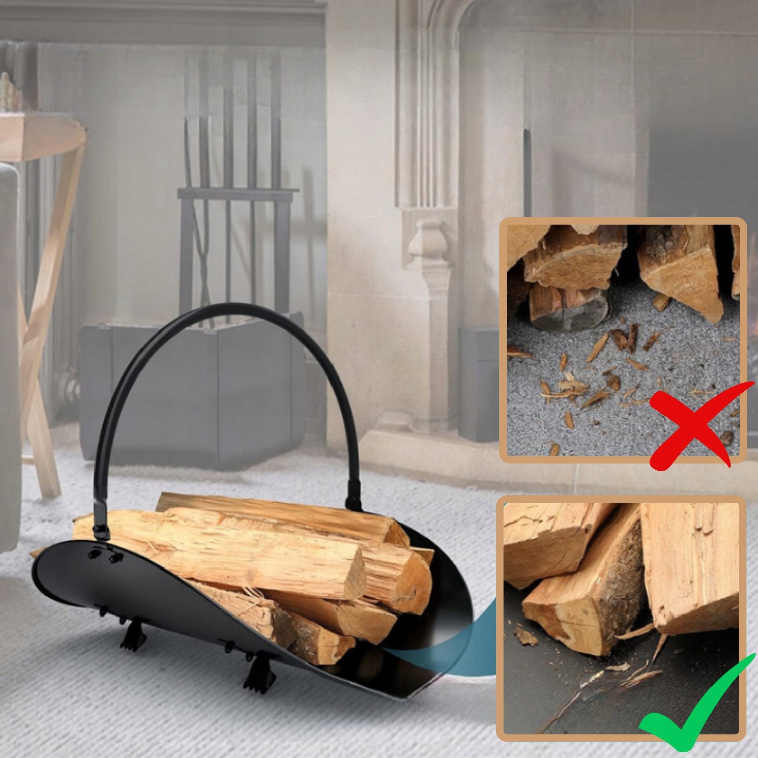 Завдяки міцній ручці ви можете зручно нести дрова прямо до каміна, не турбуючись про те, що шматки розсипляться. Сталева конструкція забезпечує стабільність, а ергономічна ручка полегшує транспортування навіть більшої кількості деревини.
