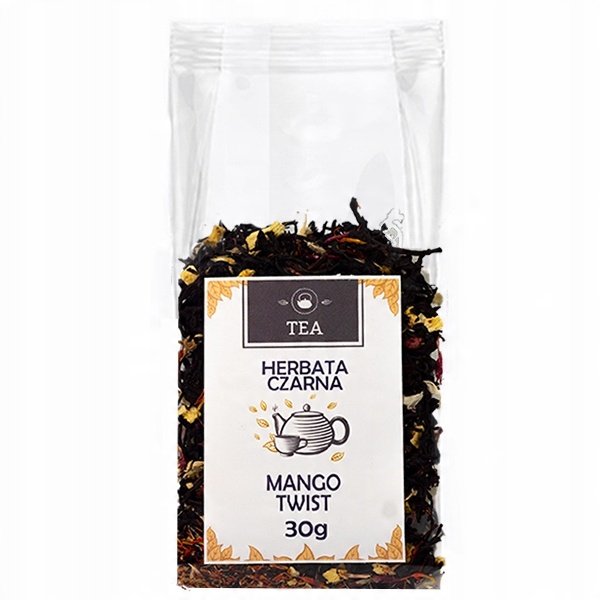 Чорний листовий чай, гібіскус, манго 4,2%, аромати, ківі, персик, плоди граната, сафлор, волошка.