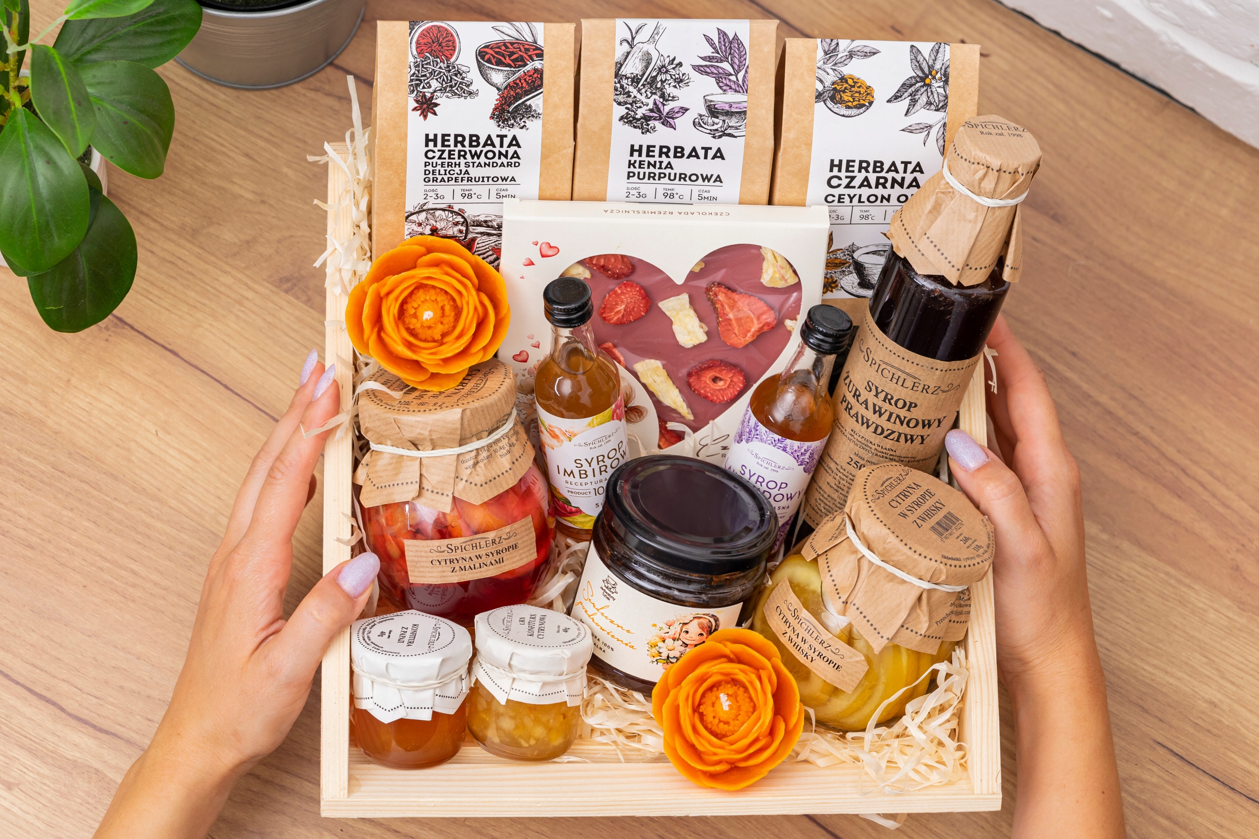 Подаруйте момент, наповнений ароматними чаями, солодкими вареннями та унікальними смаками. Цей елегантний дерев’яний кошик ручної роботи зберігає справжні скарби.