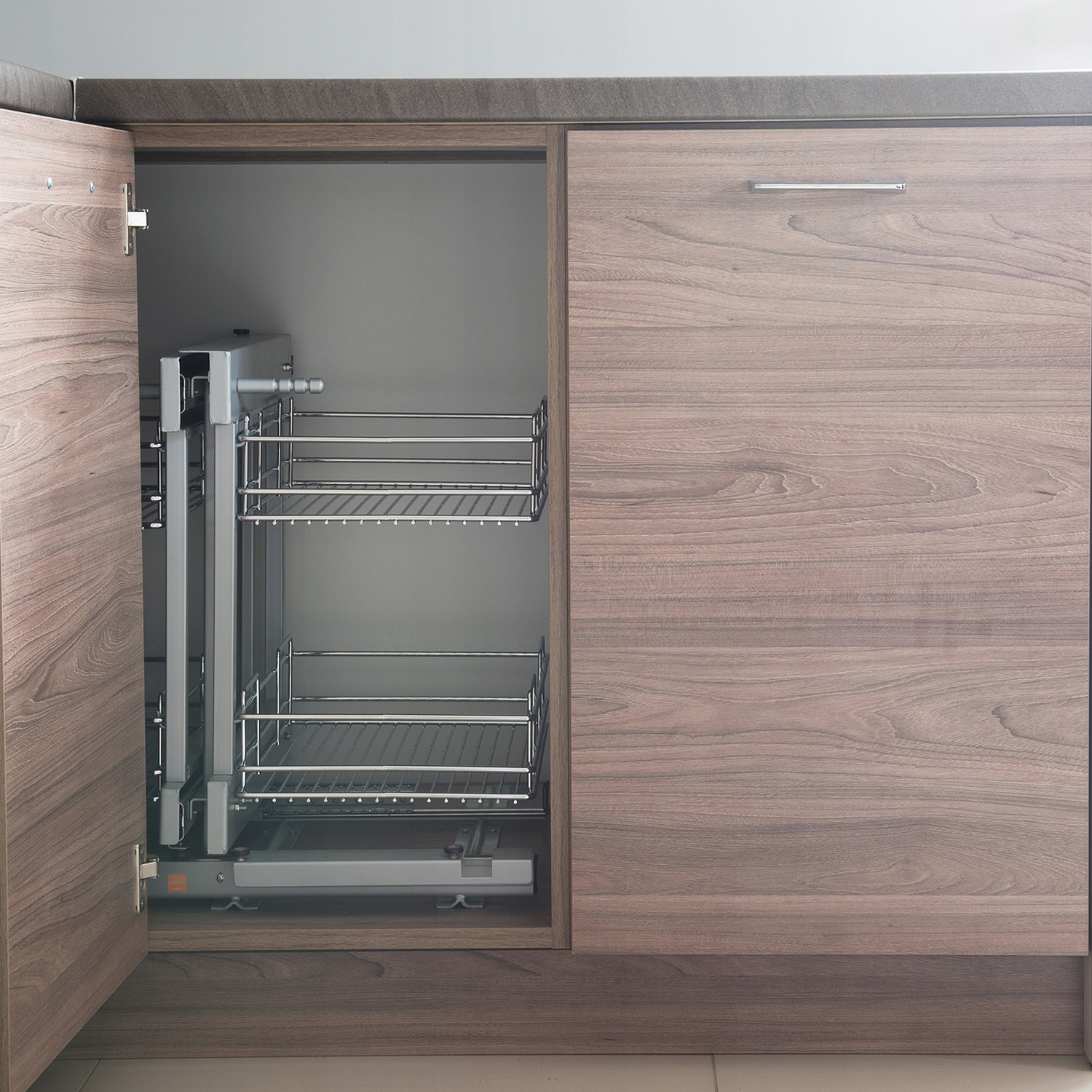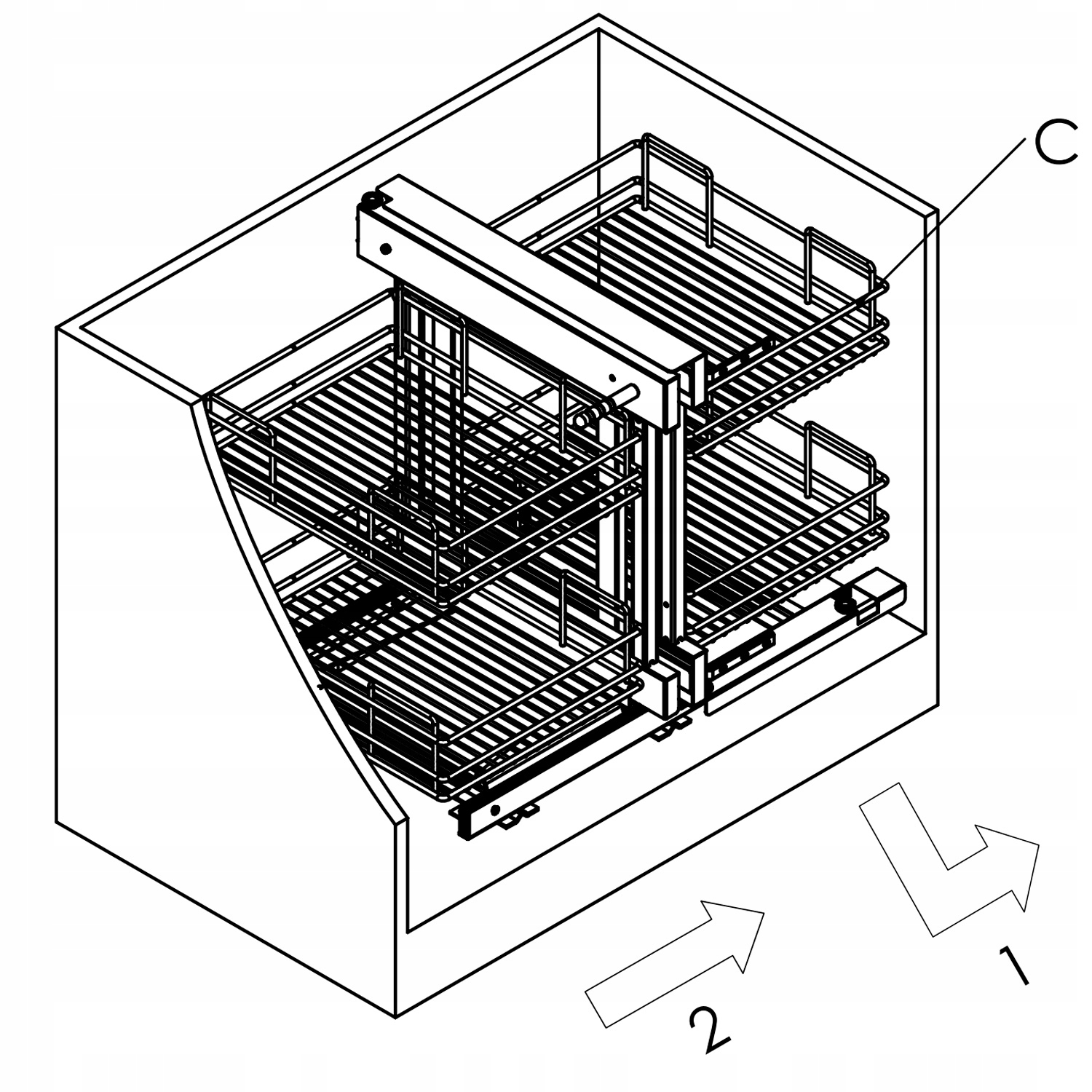 Характеристики продукту: Функціональна система управління простором для нижніх кутових шаф, Плавна та тиха робота, Дуже стабільна, Напрямні з функцією повного висування, Можливість монтажу спереду
