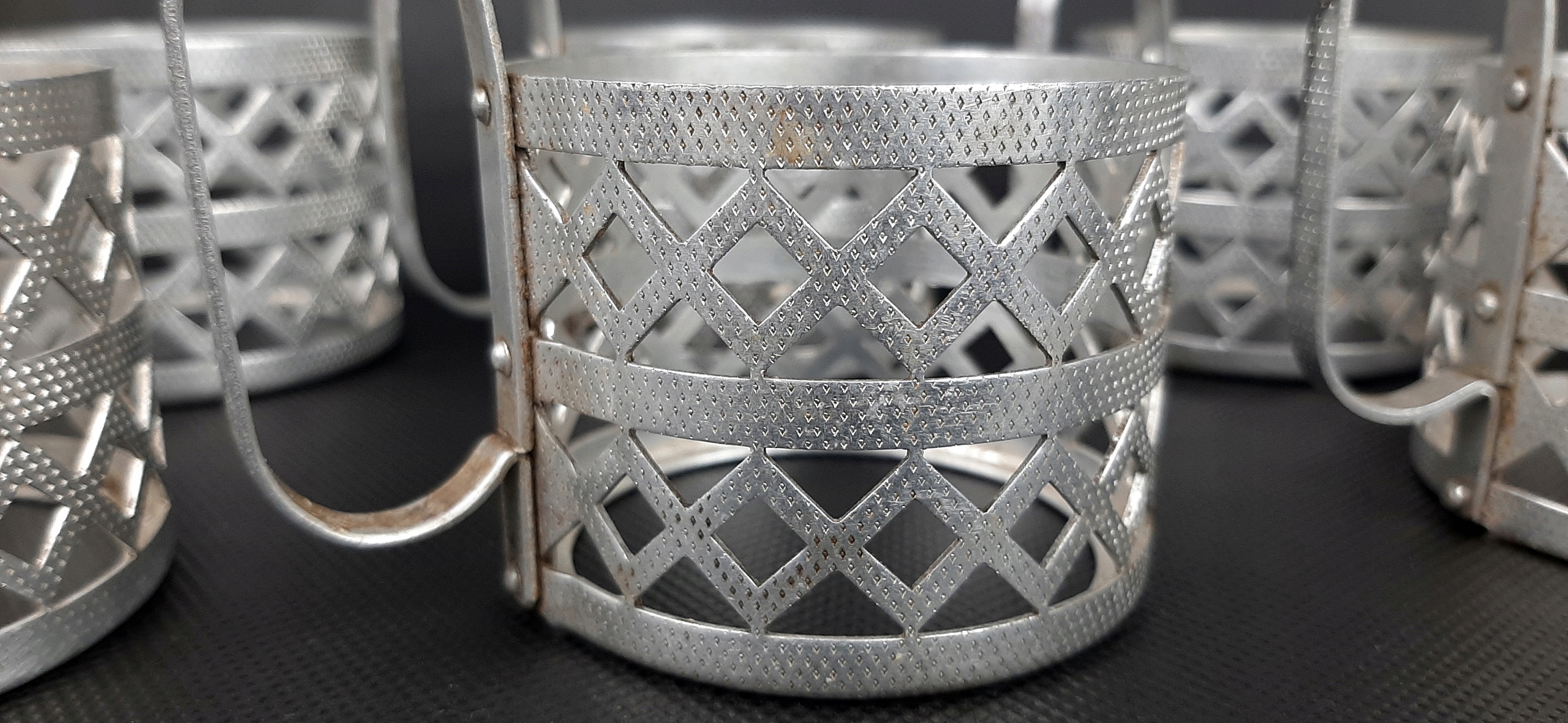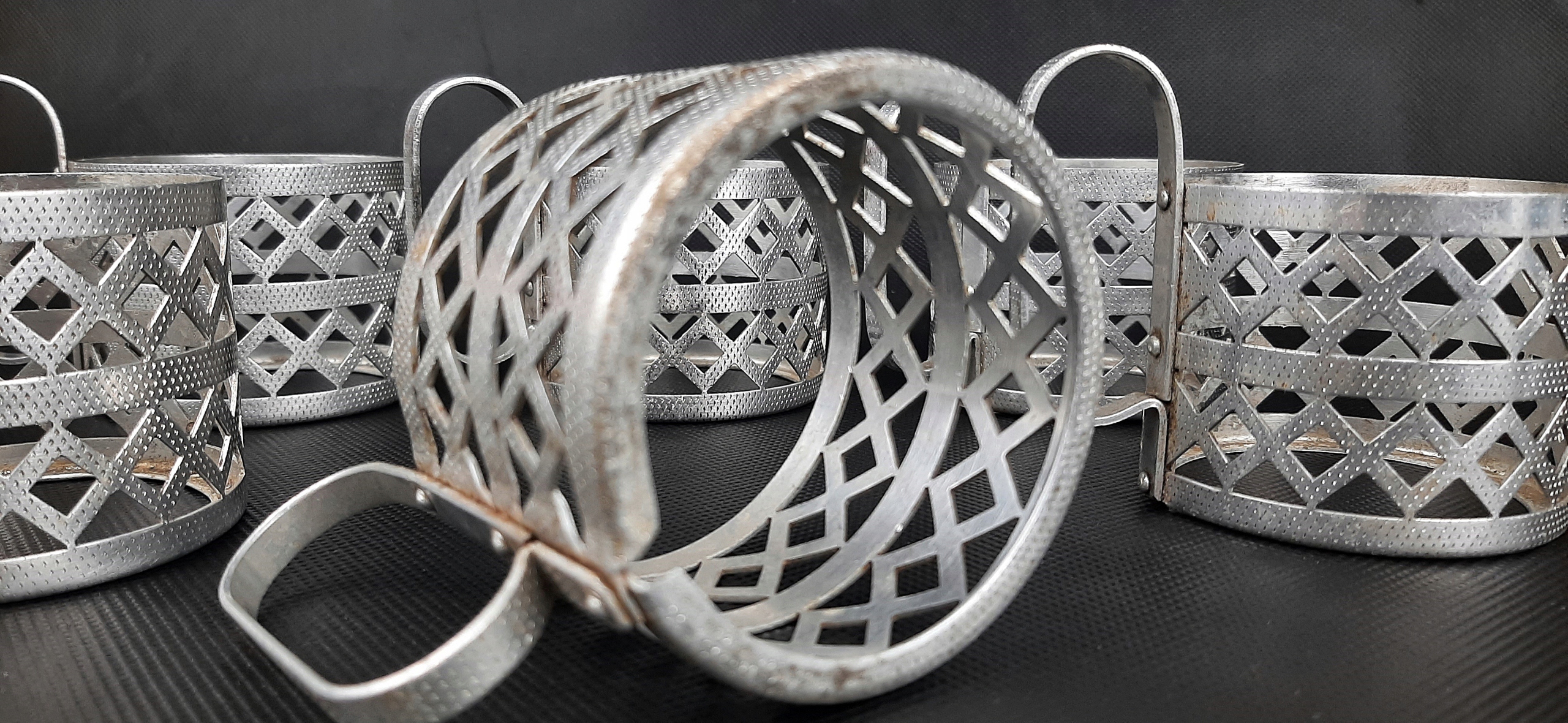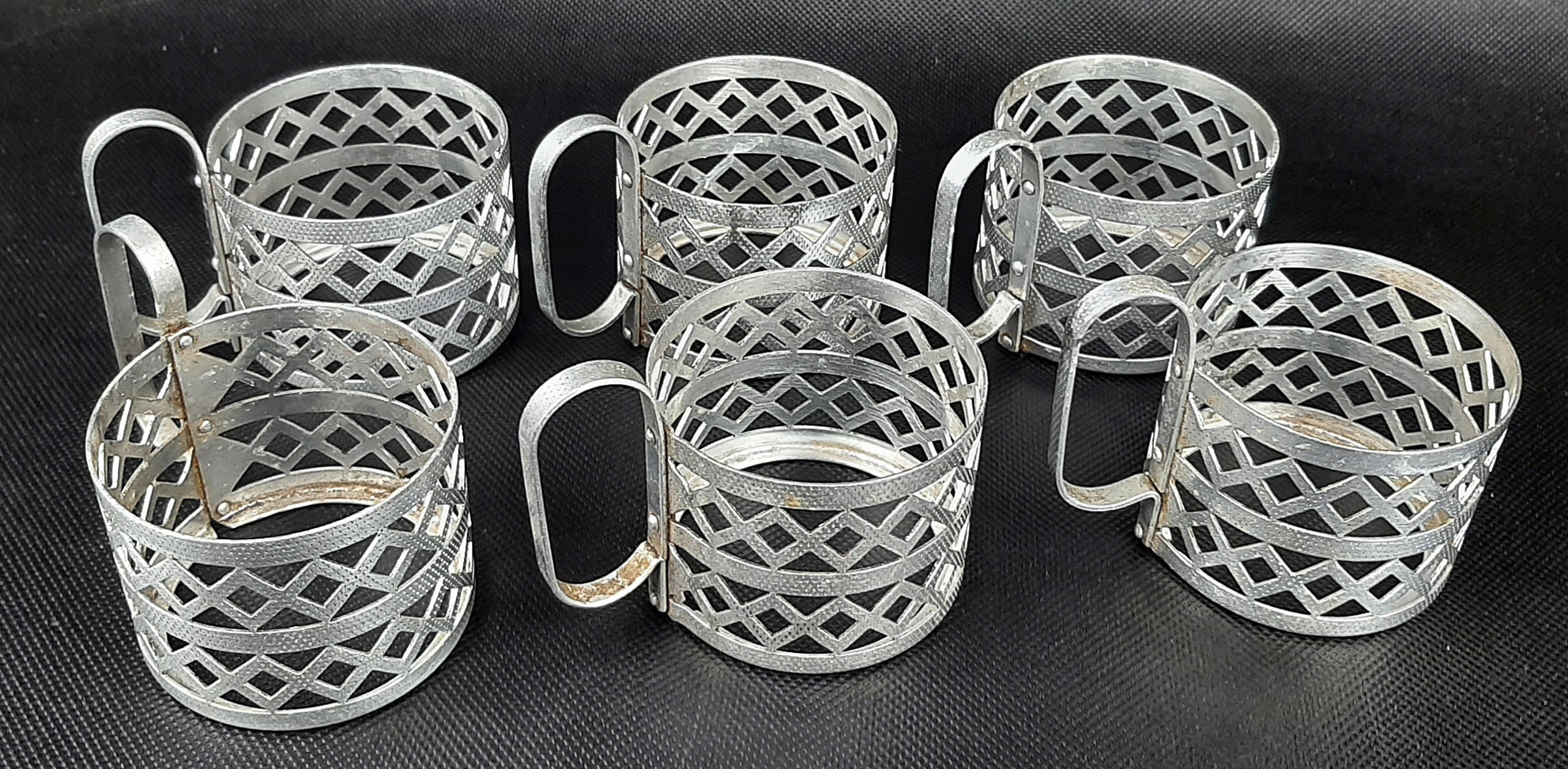 ОРИГІНАЛЬНІ старі кошики для келихів з ПНР, 6 шт. - алюміній з цікавим малюнком. . Кошики в дуже хорошому стані, нормальні сліди використання, де-не-де невеликі зміни кольору. Кошики не мають підкладки та інших механічних пошкоджень, не гнуться.