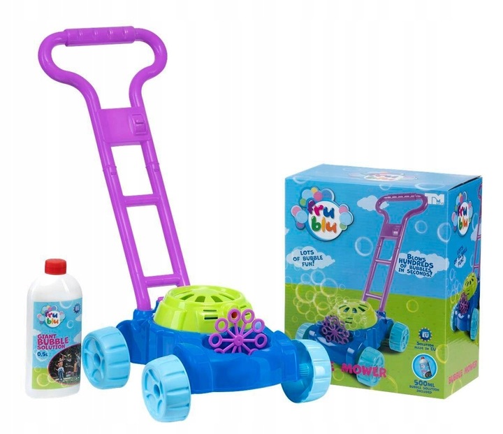 Поєднайте гарну розвагу з магією мильних бульбашок! Насолоджуйтеся різнокольоровими бульбашками в парку під час прогулянки, в саду чи на ігровому майданчику та грайте, де завгодно. У набір входить велика рідина Fru Blu 0,5 л. Косарка має два варіанти створення мильних бульбашок: