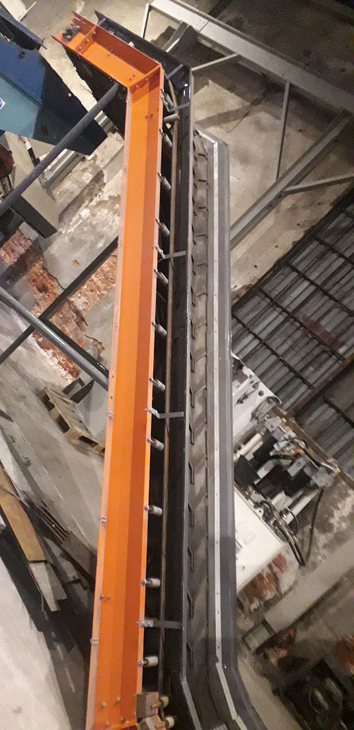 КОСИЙ СТРІЧКОВИЙ КОНВЕЄР ТИПУ ZET, ЩО ПІДНІМАЄ МАТЕРІАЛ ДЛЯ НАСТУПНОЇ МАШИНИ