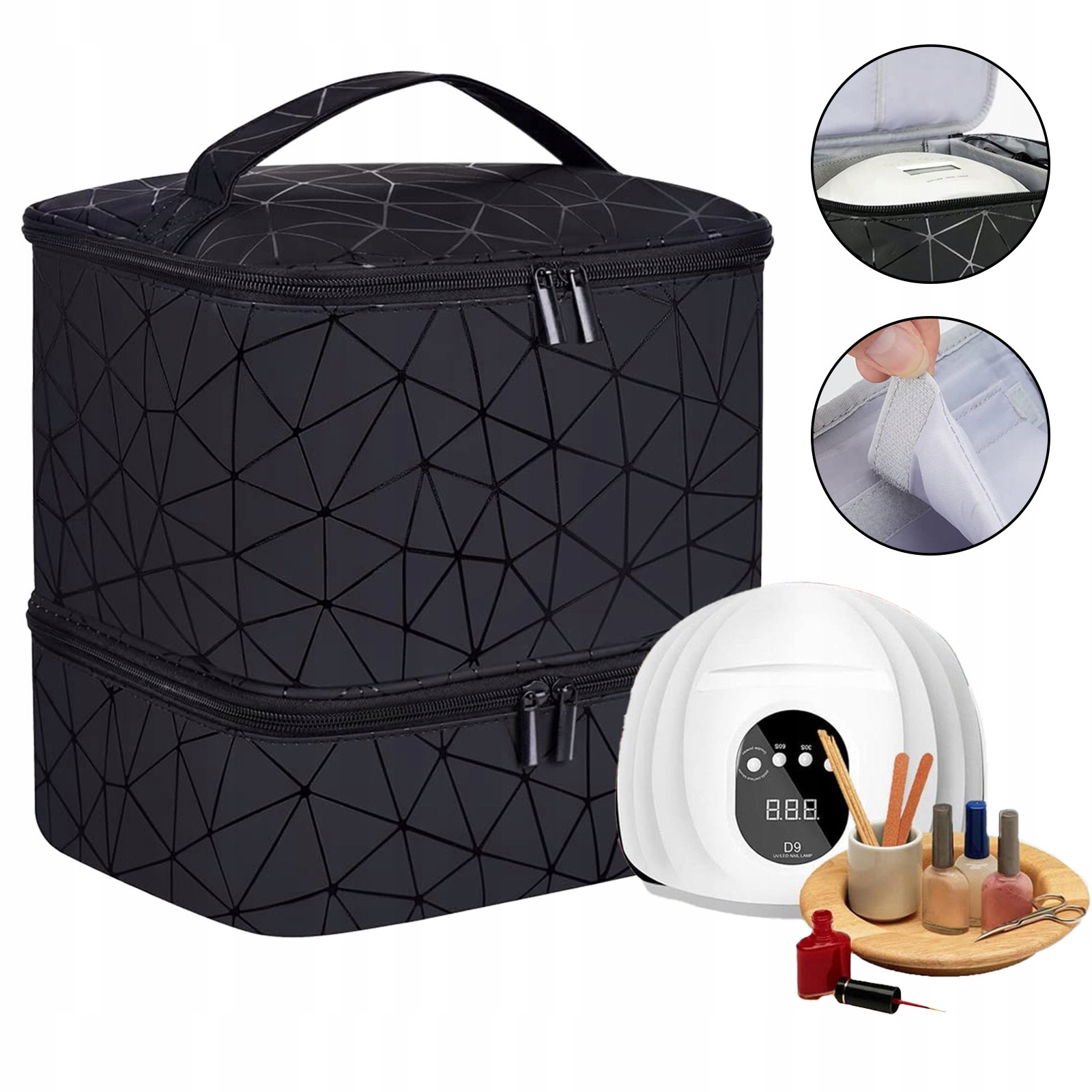 Ця сумка для зберігання має численні відділення та достатньо місця для лампи для нігтів, лаку для нігтів, ватних паличок і рідини для зняття лаку. Завдяки цьому все організовано та легко доступно. Зверніть увагу, що в комплект входить лише сумка.