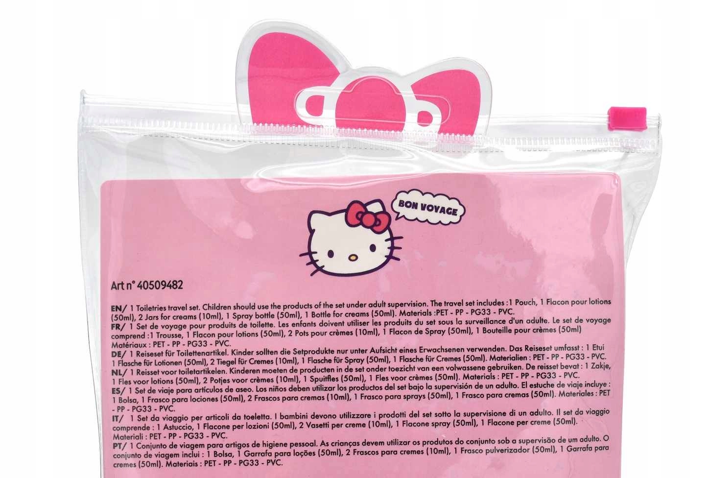 HELLO KITTY Набір прозорих туристичних флаконів для літака з косметичкою зробить вашу подорож літаком комфортнішою. Набір пляшок і контейнерів дозволить взяти з собою в ручну поклажу необхідну косметику і рідини. Вам не потрібно турбуватися про перевищення ліміту рідини під час служби безпеки в аеропорту. Кожна пляшка має розмір50 мл. Ліміт однієї пляшки рідини на авіакомпаніях становить 100 мл. Кожна пляшка виготовлена з ПВХ PET PP PG33. Пляшки герметичні і зменшують ризик розливання рідини під час подорожі. Один ізконтейнерів насосаобладнаний дозатором, що замикається. Флакон розпилювача має захисну кришку. Третій флакон має герметичну кришку. У комплект також входять дві невеликі контейнери для кремів ємністю 10 мл >. Все це упаковано в косметичку, прикрашену графікою з казки HELLO KITTY.