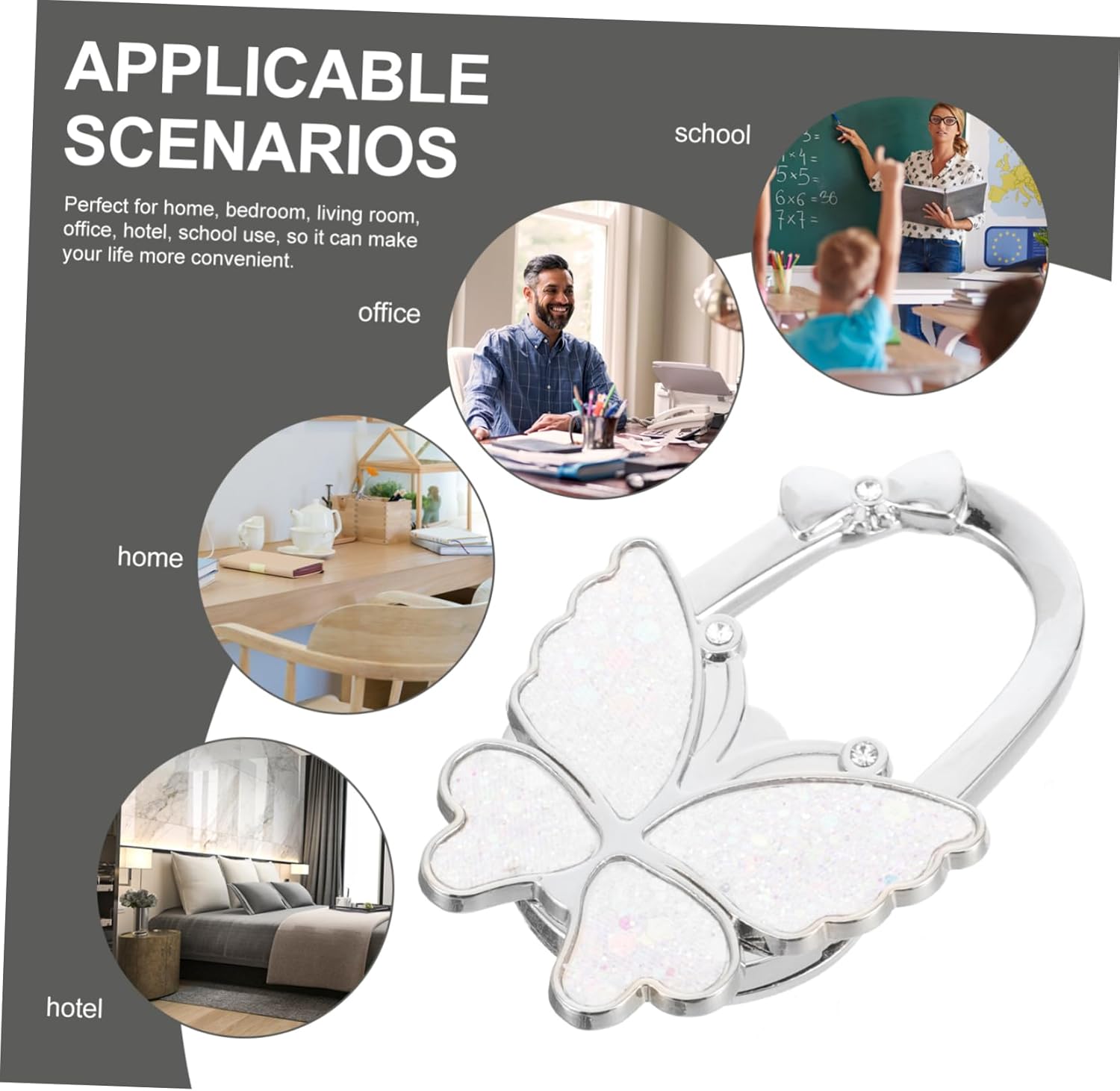 Складна вішалка для сумки метелик з металевого матеріалу, міцна і корисна, ідеальна і практична, не деформується і не вицвітає на схід. Гачок для сумки, стильний і привабливий, унікальний і шикарний дизайн метелика, складається, простий у використанні і практичний. Складний гачок-метелик можна використовувати для підвішування сумочок, сумок, сумок для покупок, сумок, підходить для жінок. Складний гачок для гаманця в формі метелика зручний і практичний гачок для гаманця можна використовувати для робочого столу вдома, вітальні, спальні та інших місць. Складний гачок для сумки-метелик, широкий спектр використання, підходить для дому, вітальні, спальні, їдальні, а також для подорожей.