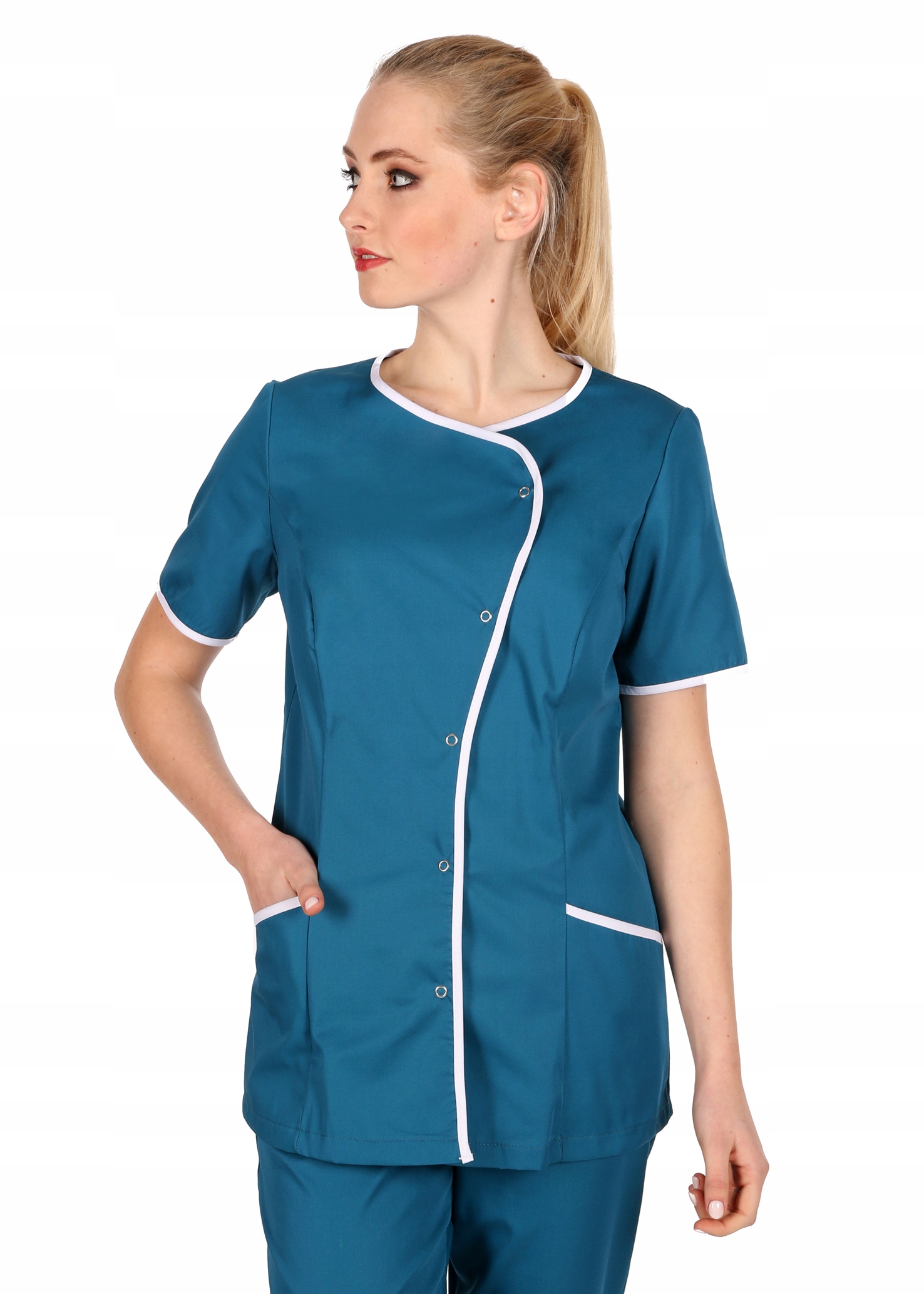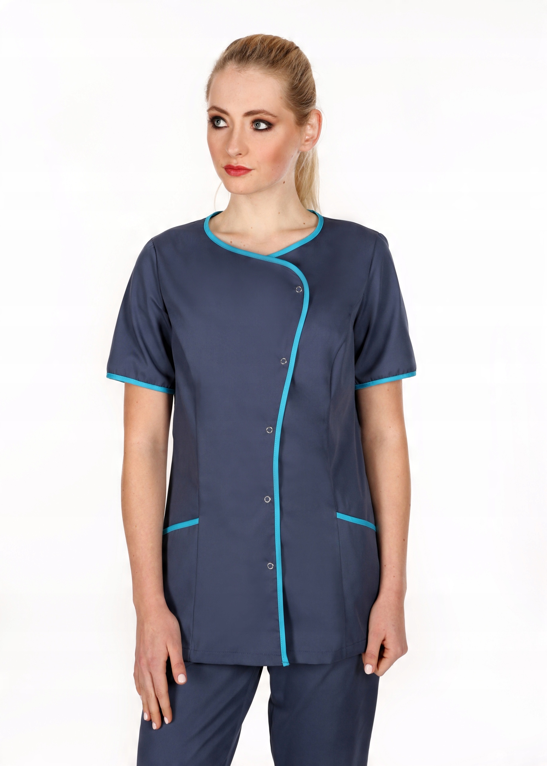 Куртка медична, медична та косметична на застібках, Schaeffer. Застібка передбачає два варіанти вирізу, французькі вирізи спереду формують силует. Можна поєднувати з брюками-сигаретами або класичними прямими брюками. Короткі рукави, дві кишені на рівні стегон (рекомендуємо тут розмістити логотип компанії або флок - для цього звертайтеся до виробника).
